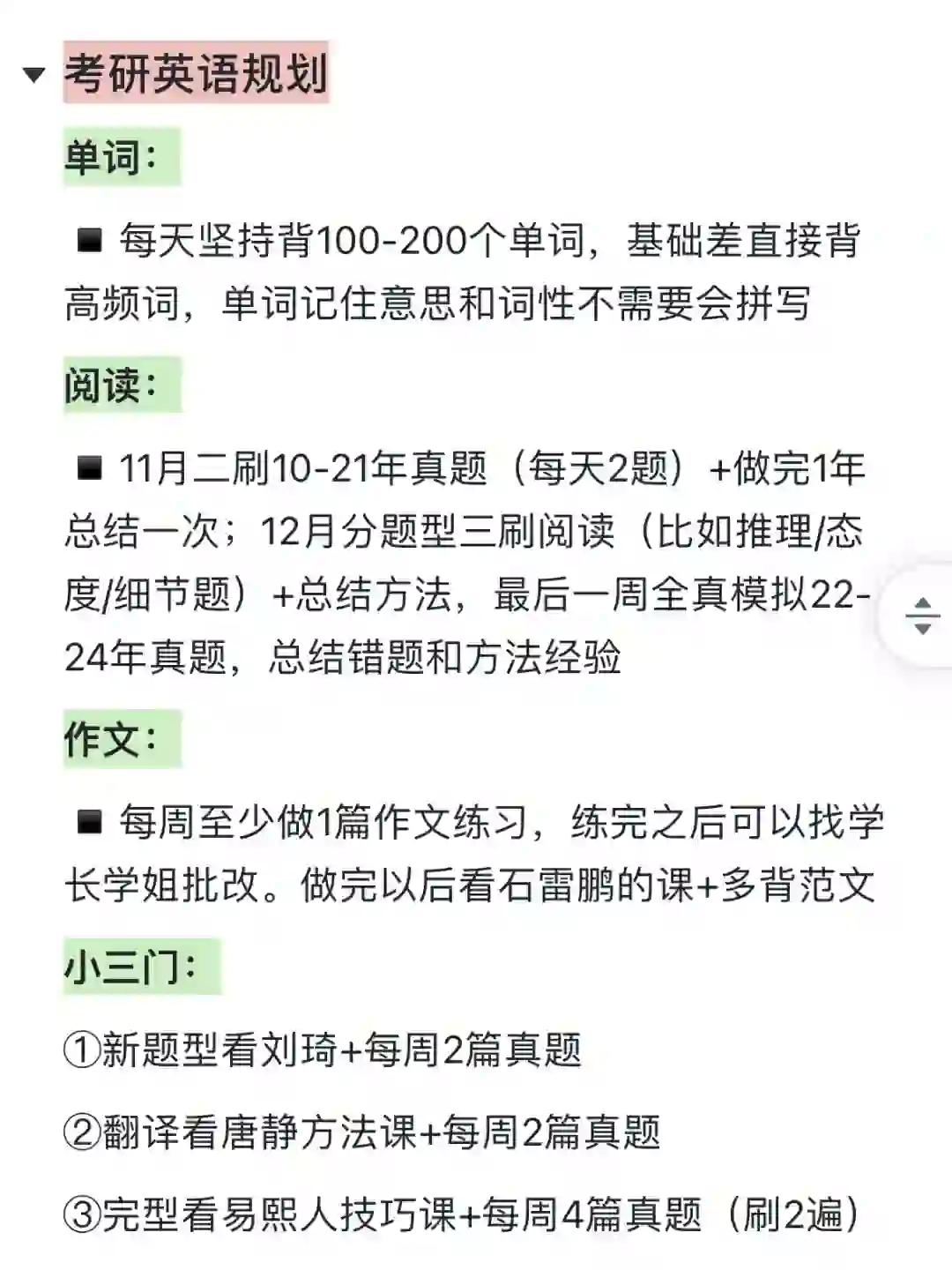 ▪️小三门:新题型看刘琦+每周2篇真题、翻译看唐静方法课+每周2篇真题、完型看易熙人技巧课+每周4篇真题