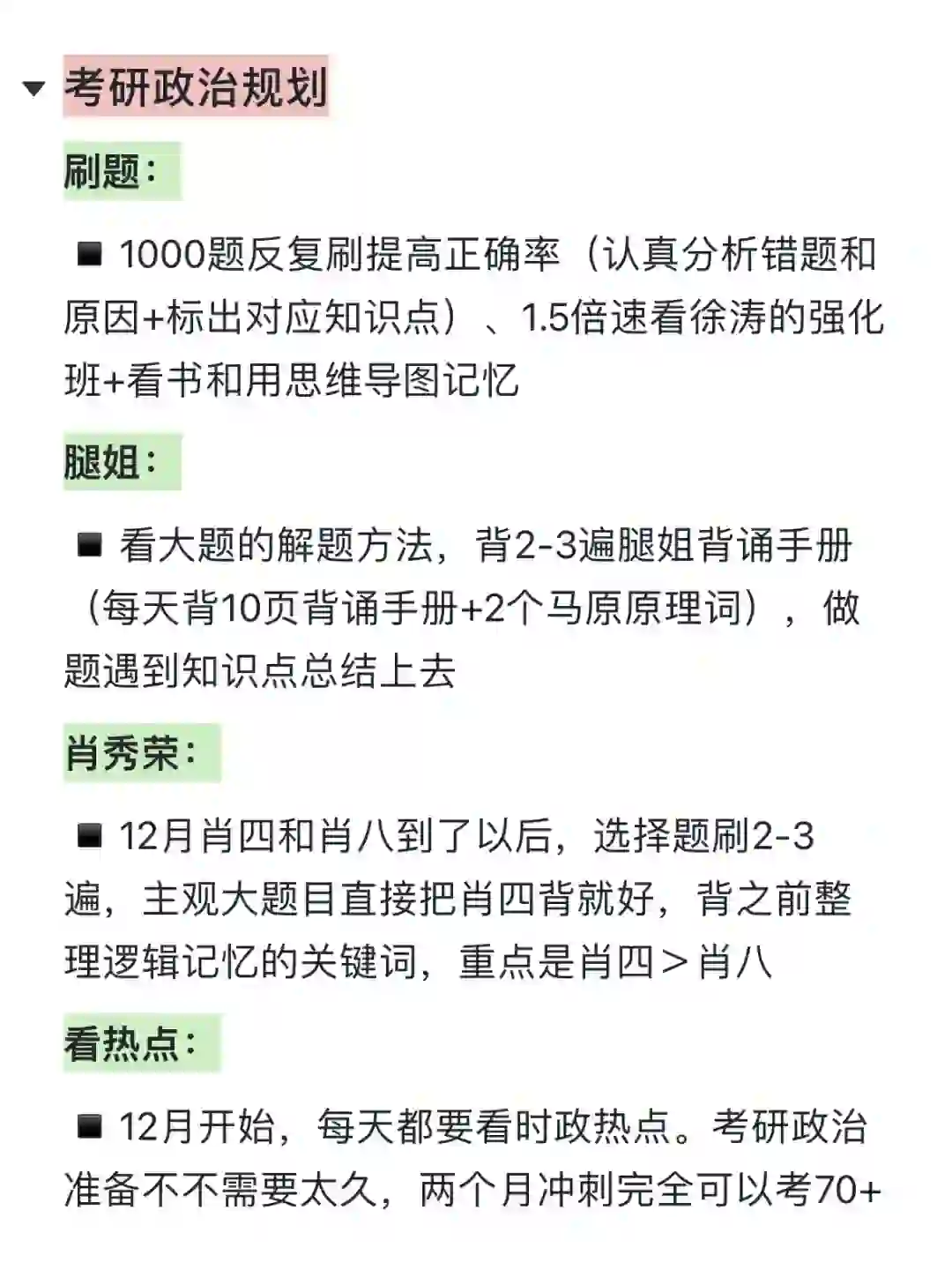 ▪️腿姐:看大题的解题方法,背2-3遍腿姐背诵手册(每天背10页+2个马原原理词),做题遇到知识点总结上去