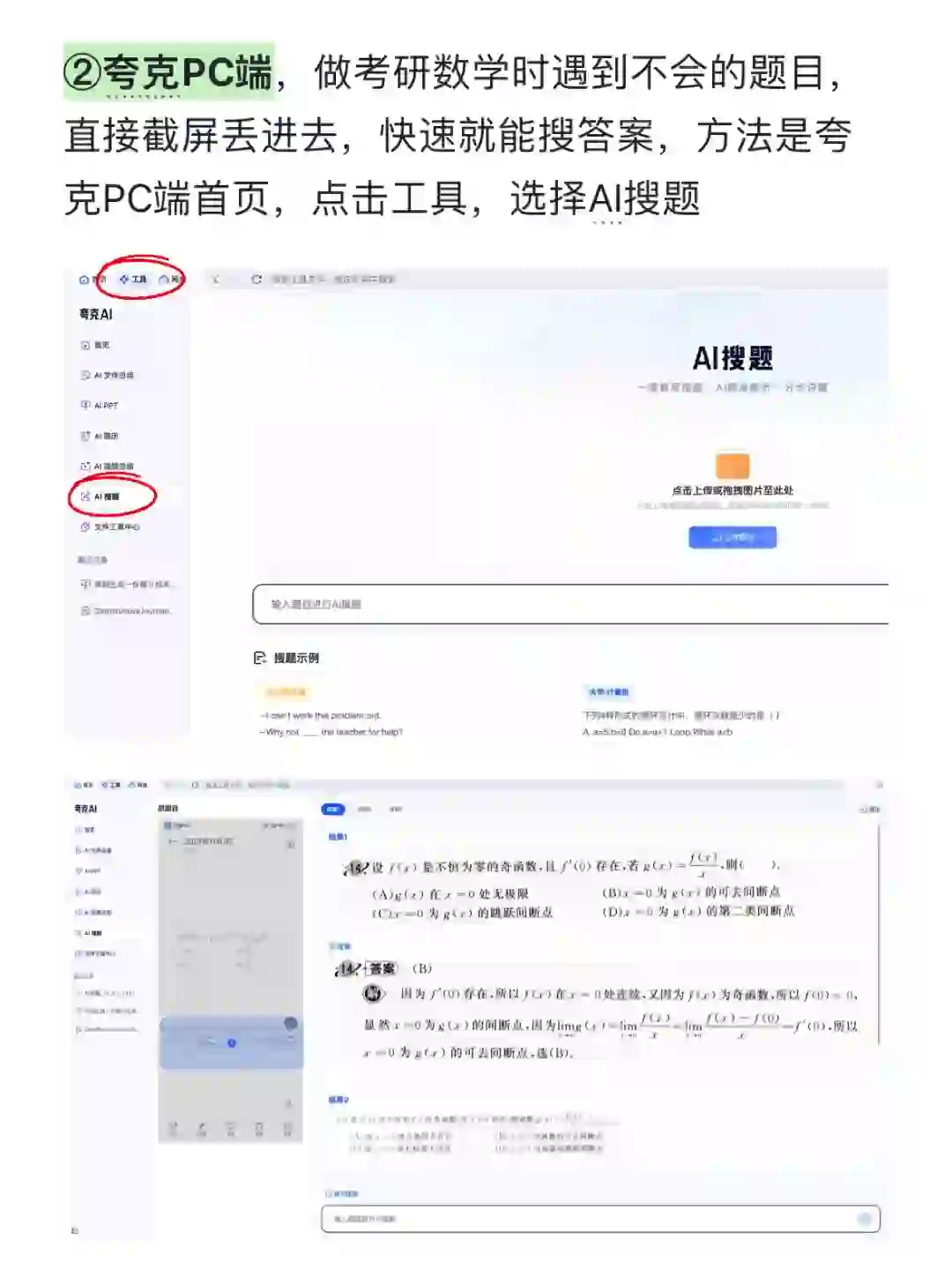 ②夸克PC端,做考研数学时遇到难题,在电脑上直接截屏丢进去,快速就能搜答案,方法是夸克PC端首页,点击工具,选AI搜题