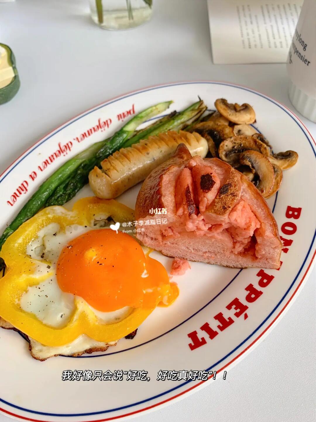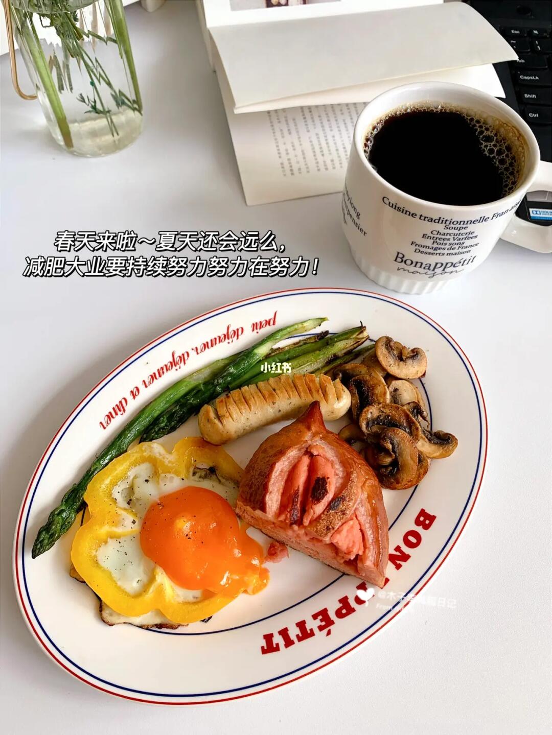🍳早餐:芭乐奶酪碱水|鸡肉肠|芦笋|口蘑|黄椒鸡蛋花|灵芝黑咖啡