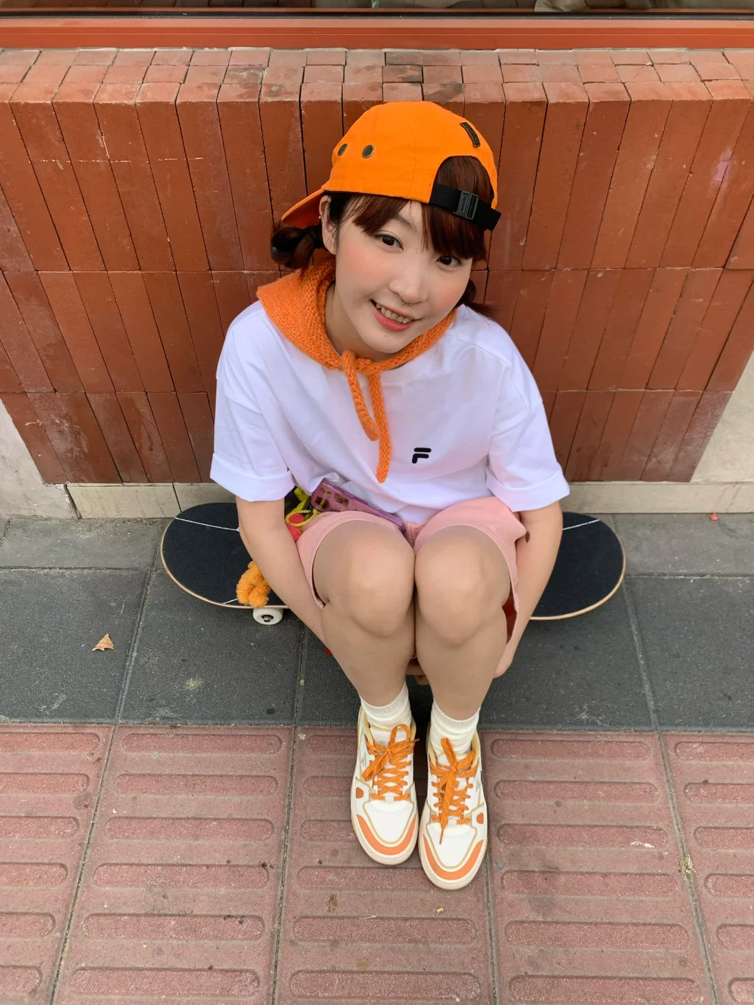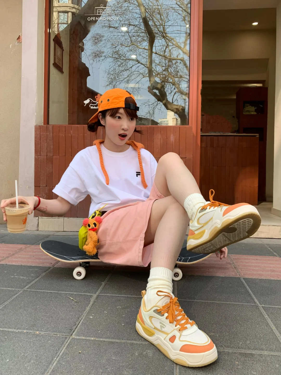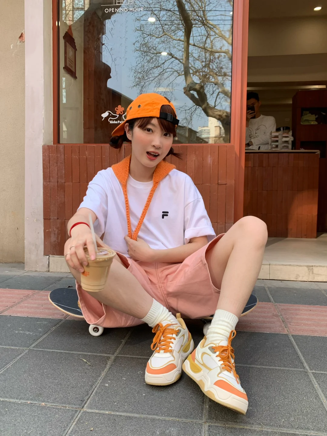 今天是橘子汽水女孩🍊 搭配了斐乐气泡水酷板鞋👟有种溢出屏幕的多巴胺! FUSION 白t加上橙色帽子的点缀显得活力满满!