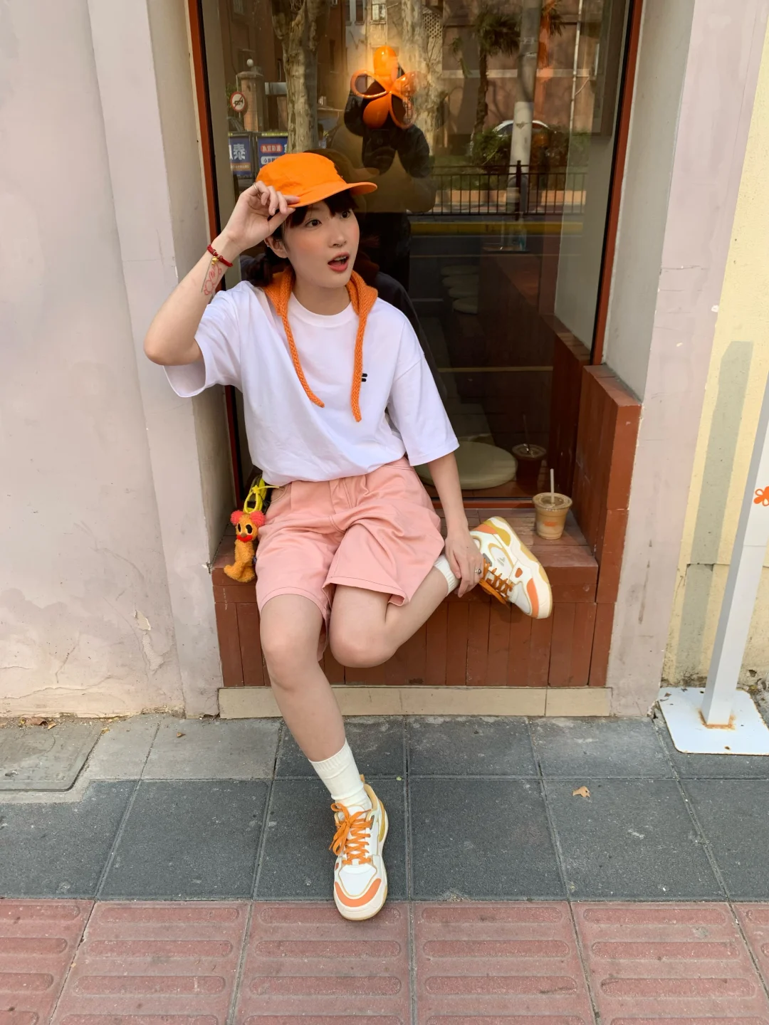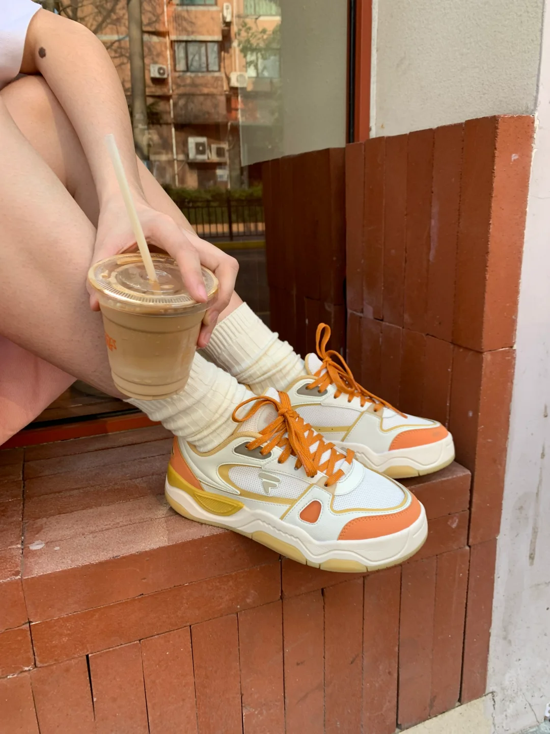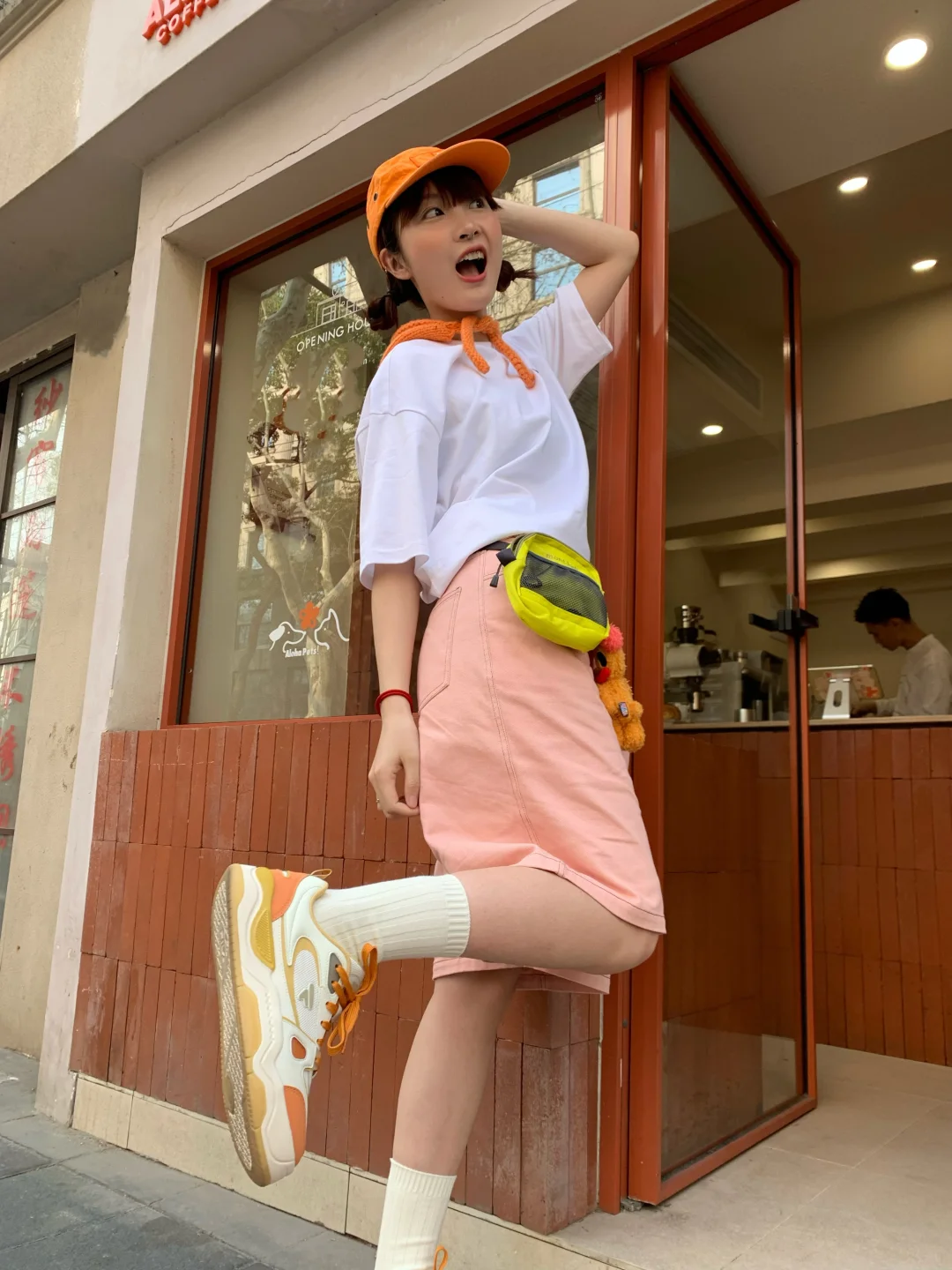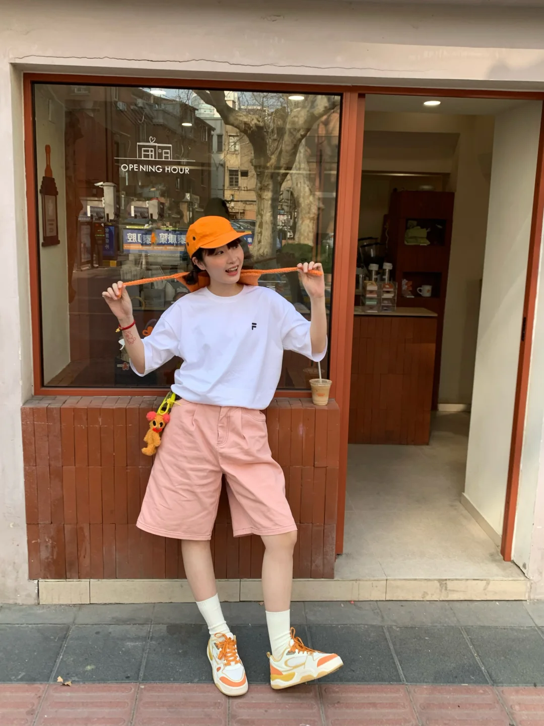 今天是橘子汽水女孩🍊 搭配了斐乐气泡水酷板鞋👟有种溢出屏幕的多巴胺! FUSION 白t加上橙色帽子的点缀显得活力满满!
