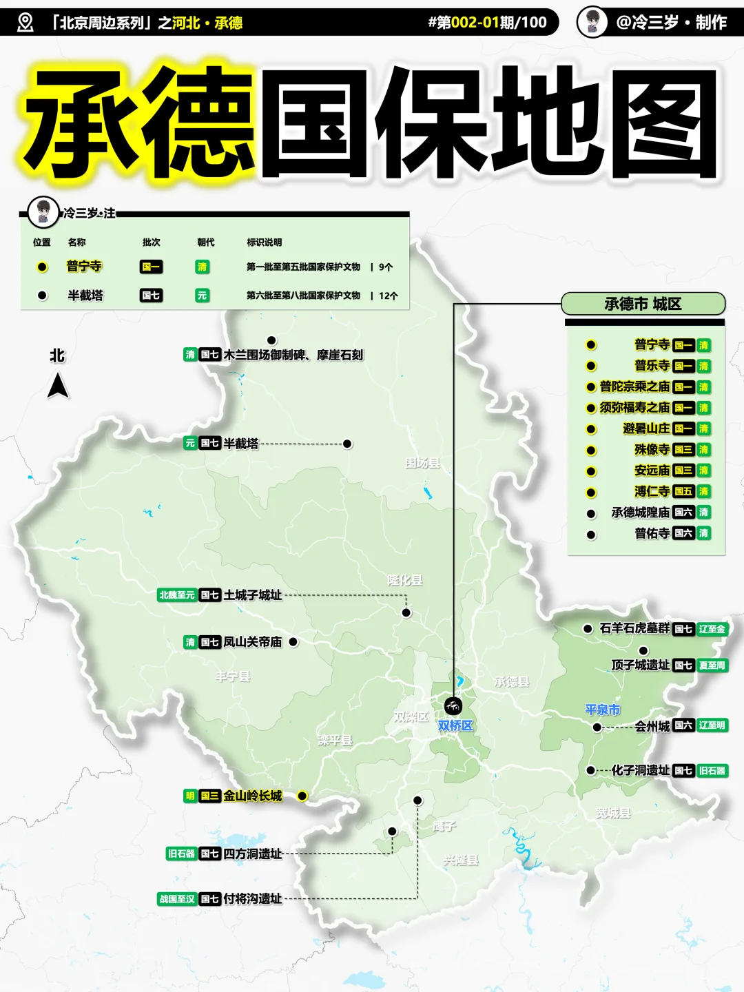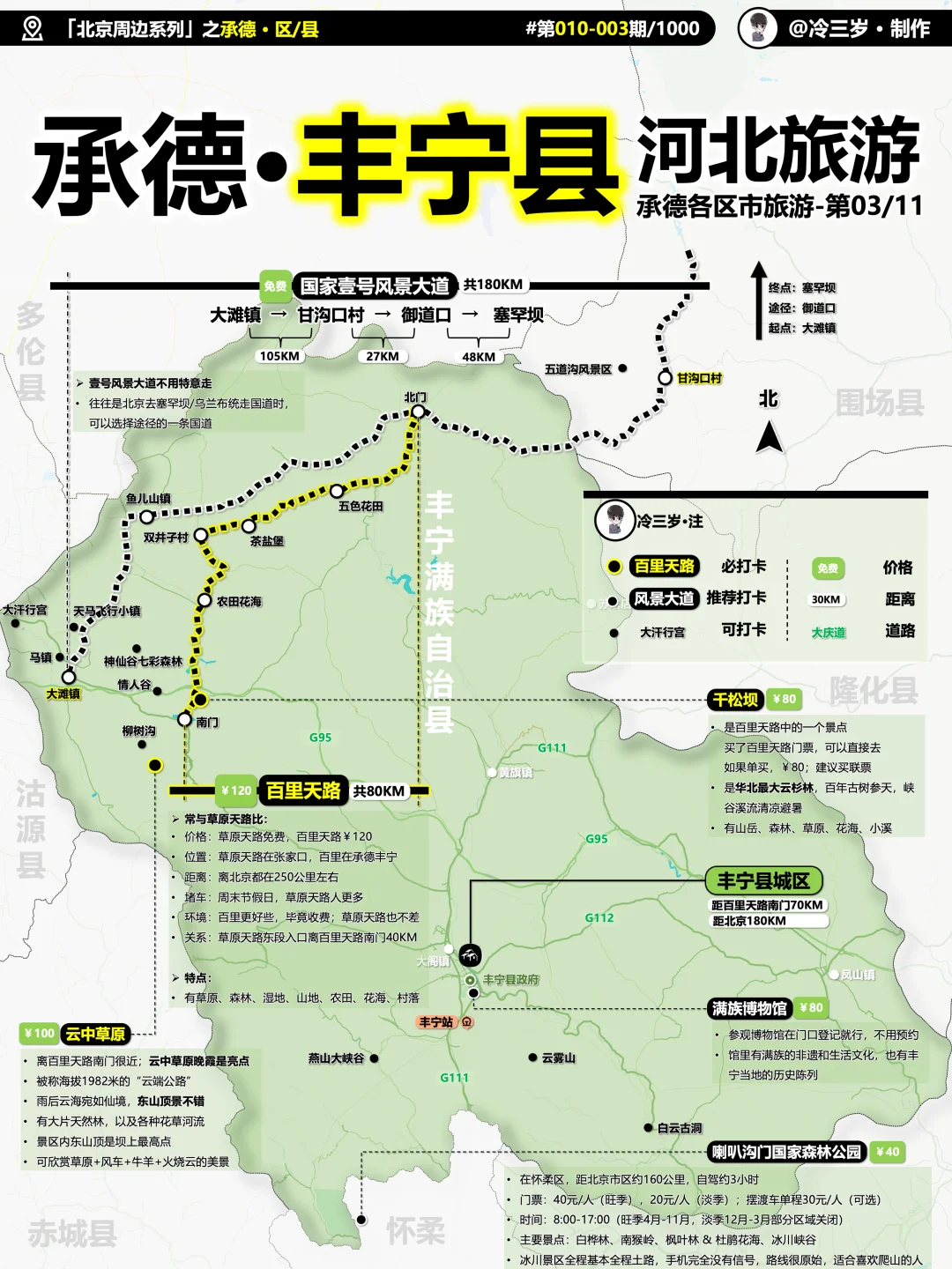 相对来说,承德好玩的主要分3个片区: [向右R]1.看古建筑:承德市区 承德市国保,特别是国一很多,首屈一指 图1标注了主要值得去的景点 同时图2、3还有更详细的备注 [向右R]2.草原自驾:丰宁、围场 图4:丰宁县 图5:围场县 图6:丰宁-百里天路 图7:塞罕坝 图8:御道口 图9:乌兰布统 图10:木兰围场/围场坝上 [向右R]3.其他区县 详见11~17 此外,如果想要高清大图,或者河北省其他市的 笔记底部自取
