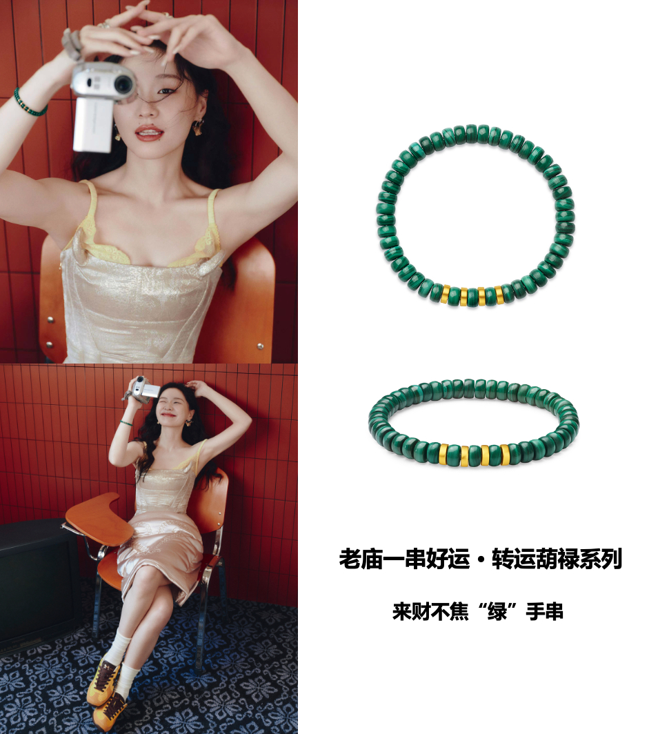 金靖状态真的超好,有一种自在舒展的美,穿搭也很有sense~这组look中,她以一身复古感十足的穿搭亮相,手腕上搭配的绿色手串成为了风格平衡的关键,让整个造型既有旧时光的韵味,又有当下的时尚鲜活感。看了下,是老庙一串好运的黄金手串,孔雀石显生命力,还能带来好运气,想要速速get~