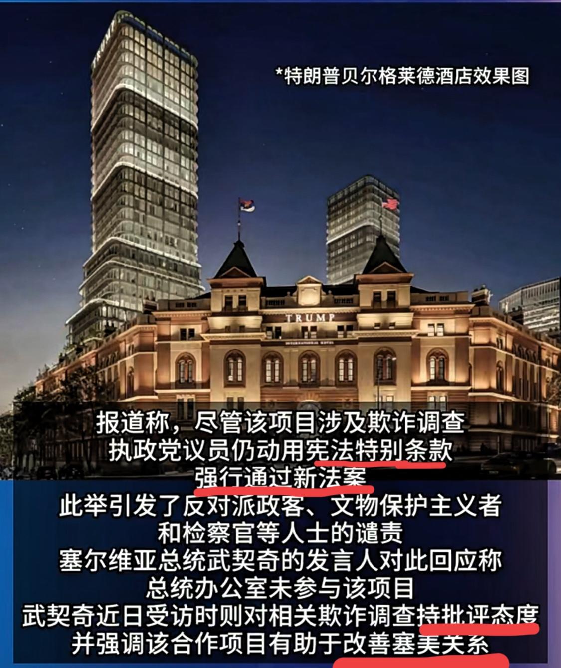 武契奇和塞尔维亚终还是“跪”了,不光把未来同欧盟一道制裁俄罗斯当作选项,更是同意了特朗普女婿在原南斯拉夫人民军大楼废墟上建豪华酒店。 近日的塞尔维亚,为了实现现实经济收益和地缘政治突破,可谓是频频“破功”。 出于压力,“无法保证未来不对俄制裁”会被俄罗斯理解,但不惜利用“特别法”和取消原南斯拉夫人民军大楼废墟的文保资格也要顺利引来特朗普女婿投资,可真够狠,这是承受多大压力才敢如此。 要知道,这座建筑在1999年北约对南联盟的78天轰炸中被毁,其残骸已小心保留了26年,是塞尔维亚民族伤痛记忆的核心象征。可如今,要被全拆了留给特朗普女婿建酒店综合体,租期99年。 从情感上来说,将象征抵抗的废墟变成赌场与按摩浴缸,且还是主谋家投资的,是对民族精神和历史牺牲的背叛。尽管开发商承诺在酒店园区内设立北约轰炸遇难者纪念碑,但这如同在伤口上撒盐又涂止痛膏,此举也不出意外的在塞尔维亚国内引来了强烈反对。 在骨气和发展间,武契奇政府终选择了后者。此举,不仅仅是因为这比5亿美元投资会给塞尔维亚经济带来直接刺激。更是因为来投资的是特朗普女婿,同其搞好关系就是在向特朗普政府释放巨大的善意和诚意。 毕竟,同美搞好关系,能换取潜在的经济利益与政治支持,武契奇的总统位置因此更稳固。同时,塞尔维亚也能向欧盟展示其外交独立性和避免过度依赖东方。 总之,武契奇政府此举是一次基于现实国家利益的、充满争议的政治计算,也反映了小国在夹缝中艰难求生存的无奈。同时,此例告诉我们,想要守护好独特的历史记忆与民族尊严,首先得自己够强大。