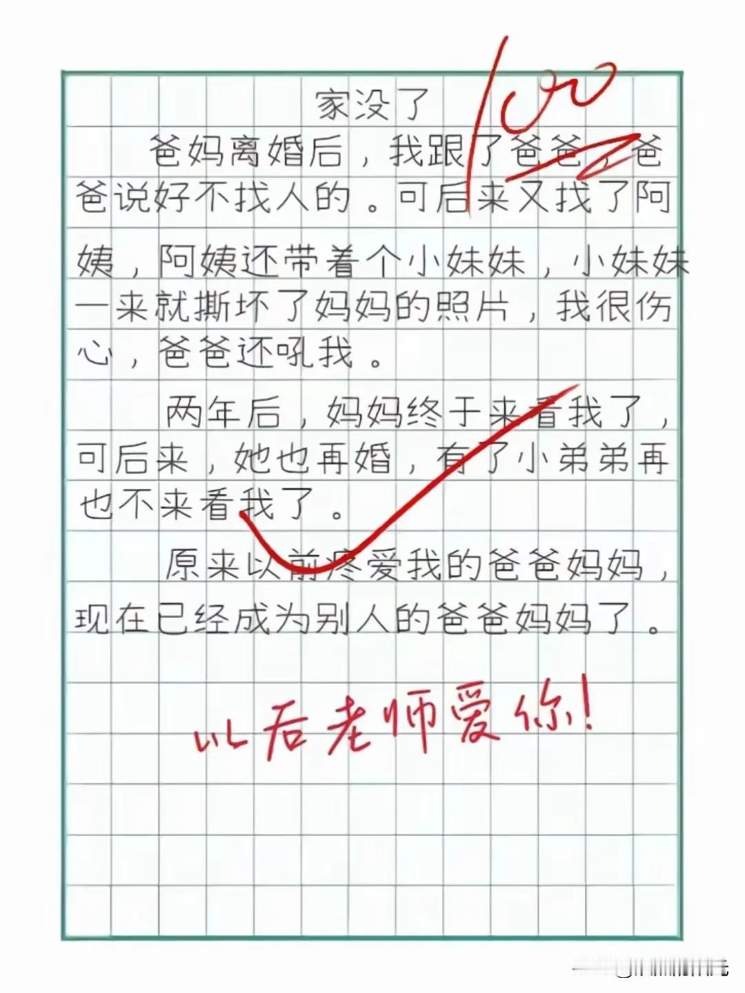看到这个孩子写的作文真的好心疼 既懂事又可怜的孩子,每一句话都暴露出他是多么渴望被爱呀! 在他天真无邪的童年里,为什么要遭受这样的对待? 夫妻俩谁离开谁都能活,可是孩子的伤害谁来弥补? 孩子是无辜的,就因为父母的自私童年蒙上了阴影 不过还好,善良的老师知道了你的遭遇,以后有她的爱你就不会孤独了![祈祷][祈祷][祈祷]为这个善良的老师点赞[赞][赞][赞] 孩子心中的委屈 最伤感的小作文 感人催泪作文
