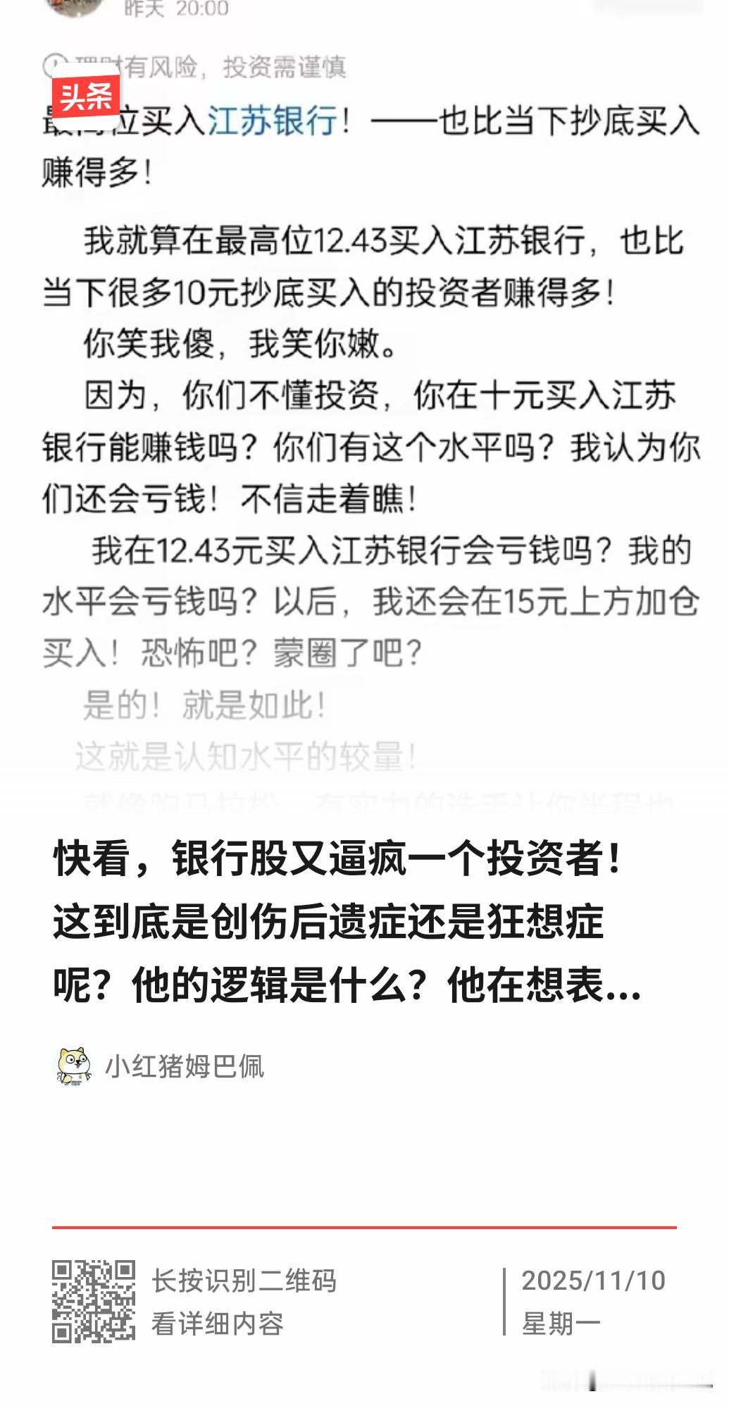 强行解释真的尬死人[笑哭] 投资的第一条,是不亏损,好公司也要买在好价格,这些都是毋庸置疑的。 压根不存在比别人多付出25%的成本买入同样的股权,再沾沾自喜觉得自己牛逼的理由,这纯粹是丧事喜办。 具体回到这条12.43元买入江苏银行赚得比10元买入者多的话题,纯粹就是脑子有问题,水平有问题。扯到什么12.43买入者未来持有更久更长,公司股价更高等,都是虚无的假设和幻想,就说这轮江苏要到可能让12.43买入者所谓“赚更多”的区间,我觉得至少涨50%吧,那也就是18.6元附近,这个价格可能需要3-4年才能见到,到时候科技牛可能都走完1-2年了,其他投资者可能早就150%获利了,你还在那里洋洋自得我12.43买入“赚更多”,实在是一部荒诞剧[祝福][祝福][祝福]