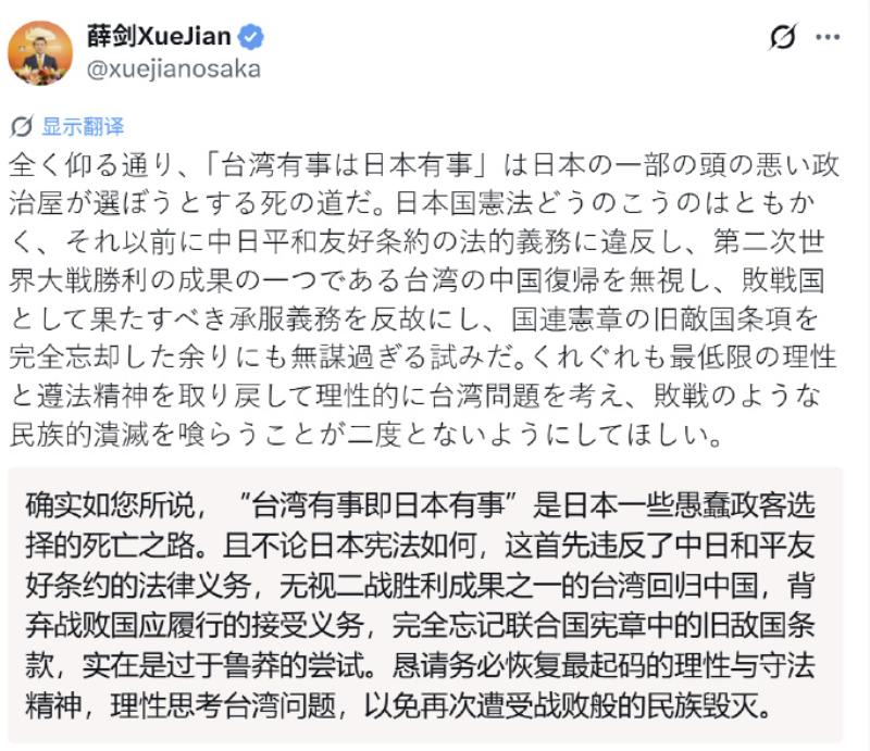 日本首相高市早苗声称“台湾有事”而可能动用武力后,中国驻大阪总领事薛剑转发相关新闻,并写道“擅自伸过来的肮脏脑袋,只能毫不犹豫地砍掉。你做好觉悟了吗!”不过,据称该帖子很快就被日本人举报后删除。薛领事继续发帖硬刚,称“台湾有事就是日本有事”是死路一条。   高市的言论本质上延续了日本政府近年来对台湾问题立场的“模糊升级”,从“关注”到“介入”,再到现在的“动武可能”,语气一步步加重。   她所提到的“动用武力”虽然在日本国内也引起了争议,但在部分政客看来,这是一种“战略震慑”,是对中国大陆在台海问题上“强硬姿态”的反制。   面对这一系列挑衅,中国驻大阪总领事薛剑的回应可谓直白且有力。他转发相关报道,并附上那句引发巨大争议的评论:“擅自伸过来的肮脏脑袋,只能毫不犹豫地砍掉。你做好觉悟了吗!”这番话,直戳日本政坛的神经,也让一些日本网民感到“惊愕”。   据日媒报道,该帖子很快被日本网友大量举报,社交平台也迅速删除。但薛剑并未因此沉默,他紧接着再度发文,强调“台湾有事就是日本有事”这种逻辑是条死路。   从外交惯例上讲,外交官一般用语克制,措辞讲究分寸。但此次薛剑的表态并不寻常,也不需要“翻译”。   这是一次带有鲜明立场的公开回应,也可以视为对日方频频越界行为的强烈警告。台湾问题是中国核心利益中的核心,无论是谁、以何种形式介入,都将面临坚决反制。这不仅仅是一次言语交锋,更是一次立场的交锋,是一次底线的申明。   值得注意的是,“台湾有事就是日本有事”这句话,最早并不是出自高市早苗,而是前首相安倍晋三在2021年提出的。   彼时他已卸任首相,但依旧在安全保障领域颇具影响力。当时他的这番言论就曾引发中国强烈不满。   如今,高市早苗再次使用这句话,并将其升级为“动武可能”,其实是延续安倍路线的体现。   日本政坛中一部分势力长期试图通过“台湾有事”来推动自身的军事正常化路径,而这也正是中国必须高度警惕的地方。   从更宏观的角度看,日本在台湾问题上的立场变化,并不是孤立事件,而是美国在亚太地区战略布局的一部分。   自“印太战略”提出以来,美国不断拉拢盟友,企图在第一岛链形成合围态势。日本作为美在亚太最重要的盟友之一,自然被赋予了更大的“责任”。   在这种背景下,日本政坛右翼势力借“台湾有事”话题炒作,既是对外宣示“责任分担”,也是对内推动军备扩张的手段。   但问题是,台湾问题不容任何外部势力插手。这不是口号,而是国家底线。任何将台海问题当作“棋子”的做法,最终都可能搬起石头砸自己的脚。   中日关系虽非敌对,但近年来因历史、领土、台湾等问题摩擦不断。尤其是在台湾问题上,日本一旦越界,势必引发更猛烈的反制。   薛剑的表态,不是情绪失控,而是底线警告。这种警告,不仅针对高市早苗,也是在向整个日本政坛发出信号。   回顾近几年中日外交互动,双方在经贸、文化等方面仍有合作空间,但在台湾问题上,中方始终态度坚决,反复强调“一个中国”原则是两国关系的政治基础。   这一原则早在1972年中日建交时就写入联合声明,是压舱石。现在,一些日本政客试图挑战这一基础,无异于自毁友好大局。   更何况,日本国内也并非铁板一块,不少学者、媒体和民众对“台湾有事”言论持谨慎态度,担心将日本卷入不必要的冲突。   而对于薛剑的发言,被删帖并没有削弱其影响力,反而进一步放大了中方立场的坚定。有人批评他的语言“过于激烈”,但现实是,面对不断升级的挑衅,外交辞令的克制有时反而被解读为退让。   薛剑的表态,正是对这种误判的主动纠偏。让对方清楚地看到中国的红线,看到中国面对挑衅时的态度,也是一种必要的战略沟通。   此次风波也再次提醒我们,舆论场并非虚拟空间,外交并非只有会议与公报。每一次表态,每一条推文,都是国家意志的延伸。   在这个信息传播速度远超以往的时代,外交官的每一次发声,都可能影响舆论走向,塑造国家形象,甚至左右地区局势。因此,敢于表达、善于表达,已成为当代外交的一项基本素养。   总的来看,这场围绕“台湾有事”的言论交锋,背后是地缘政治格局的深刻变化,是中国在保护国家主权完整方面的坚定立场,也是对外界错误认知的有力纠偏。   高市早苗的表态固然令人警惕,但真正值得思考的是,为何日本一些政客热衷于拿“台湾有事”做文章,而不是思考如何在不引发对抗的前提下处理与中国的关系。   外交不是喊口号,更不是逞口舌之快,而是一场场硬碰硬的较量,是对国家利益的守护,是对和平稳定的真正负责。   台湾问题不容模糊,更不容挑衅。任何试图插手的外部势力,都将面临中国的坚决反制。中日之间的这场言语交锋,远未结束,但底线已经划出,任何越线行为,都必须承担相应后果。 以上是我的观点,你们觉得呢???