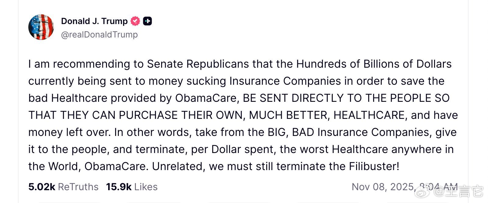 我建议参议院共和党人,将目前为了挽救奥巴马医改提供的糟糕医疗保健而流向吸血保险公司的数千亿 美元,直接拨给人民,让他们能够购买自己更好的医疗保健,并且还有剩余。换句话说,从那些 邪恶的大保险公司那里拿走钱,交给人民,并终止世界上每花费一美元就最糟糕的医疗保健—— 奥巴马医改。另外,我们仍然必须终止阻挠议事!