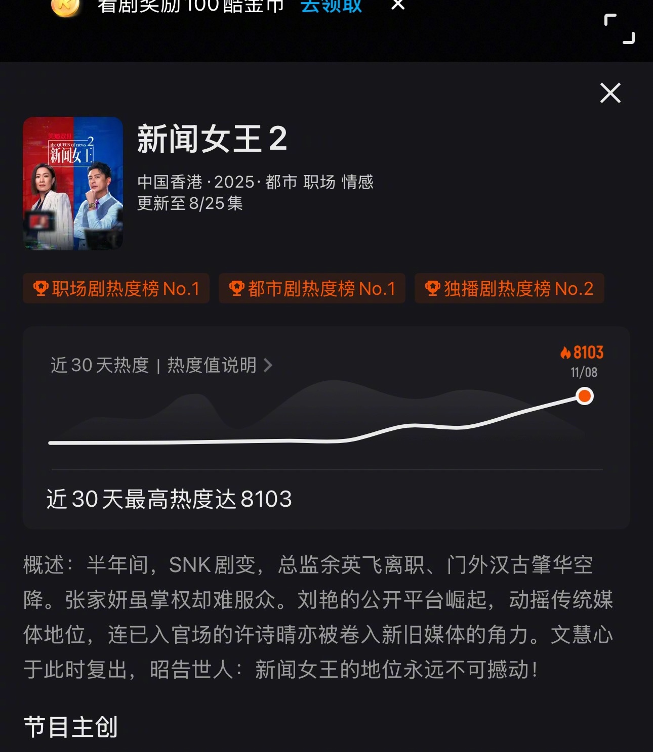 新闻女王2热度突破8100,感觉破万会轻轻松松啊!这才是无水分的热度,纯靠剧情[good]