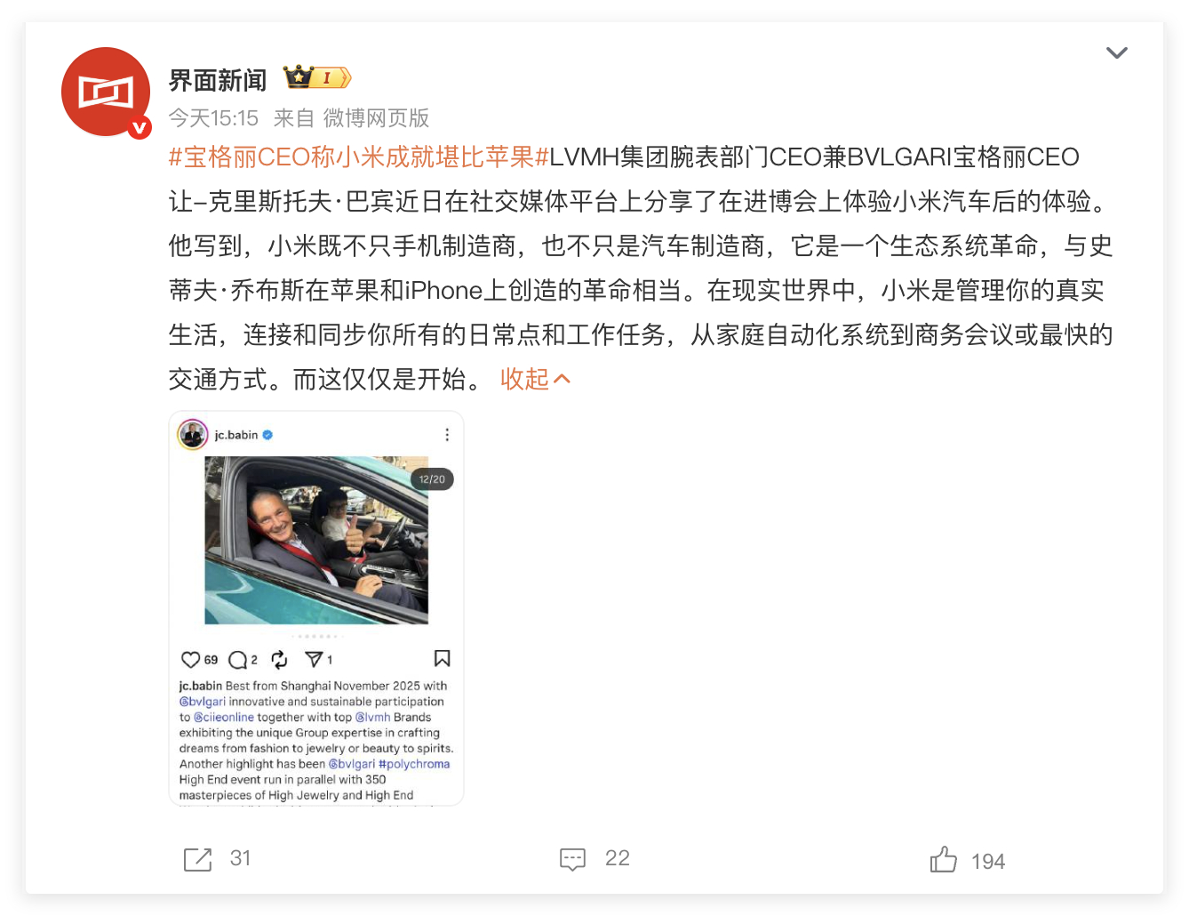 宝格丽CEO称小米成就堪比苹果一个组装厂还谈上成就了,小米拿什么比苹果,靠改名吗