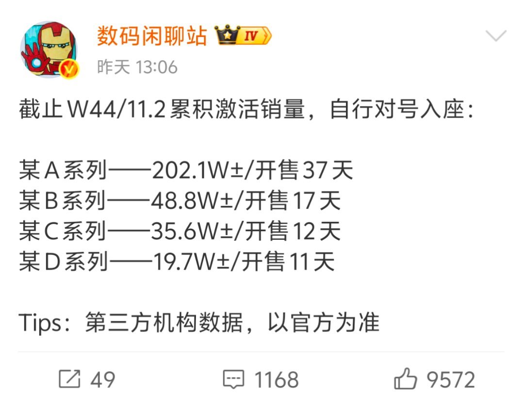 iPhone17系列国内激活销量iPhone17系列的国内激活销量达到了825W+,而其它4个旗舰系列的激活销量则最高一个是202.1W。虽然这只是截止11.2的第三方数据!iPhone还是太强了,对标上没赢过,销量上没输过……