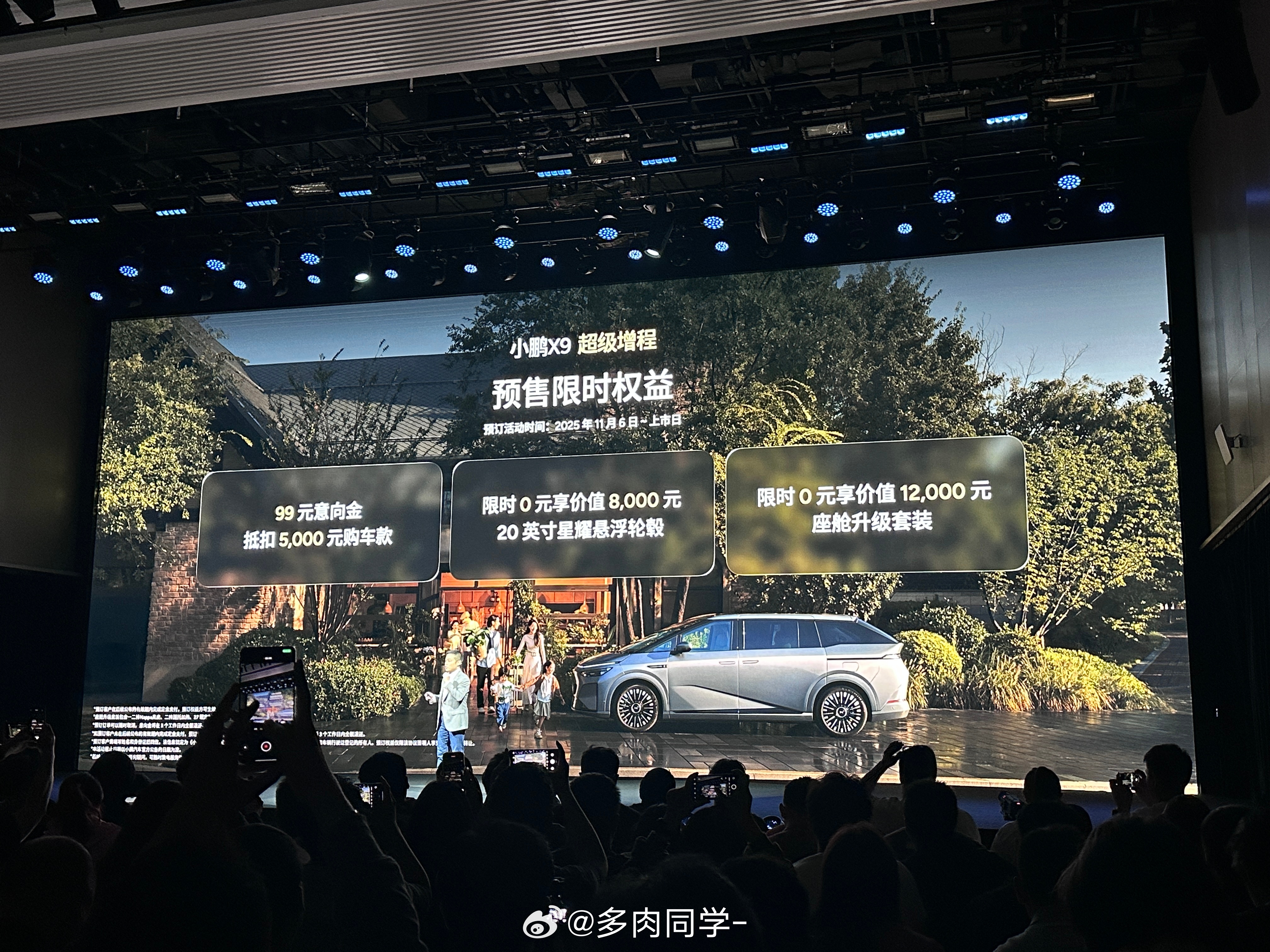 2025年11月6日-上市日,预订用户均可享受99元意向金抵扣5000元购车款;同时限时0元享价值8000元的20英寸星耀悬浮轮毂和价值12000元的座舱升级套装,小鹏X9老车主专享置换权益10000元,感谢每一位鹏友的信任与选择