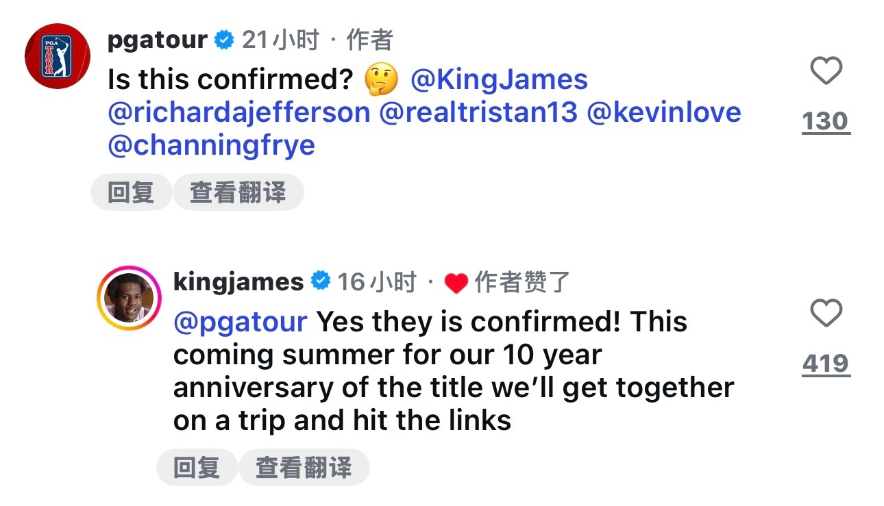 随后,PGA在评论区询问这次十周年聚会能否被证实,詹姆斯回复道:“是的,这可以被确认!明年夏天是我们夺冠十周年纪念,我们会一起旅行,打高尔夫。”