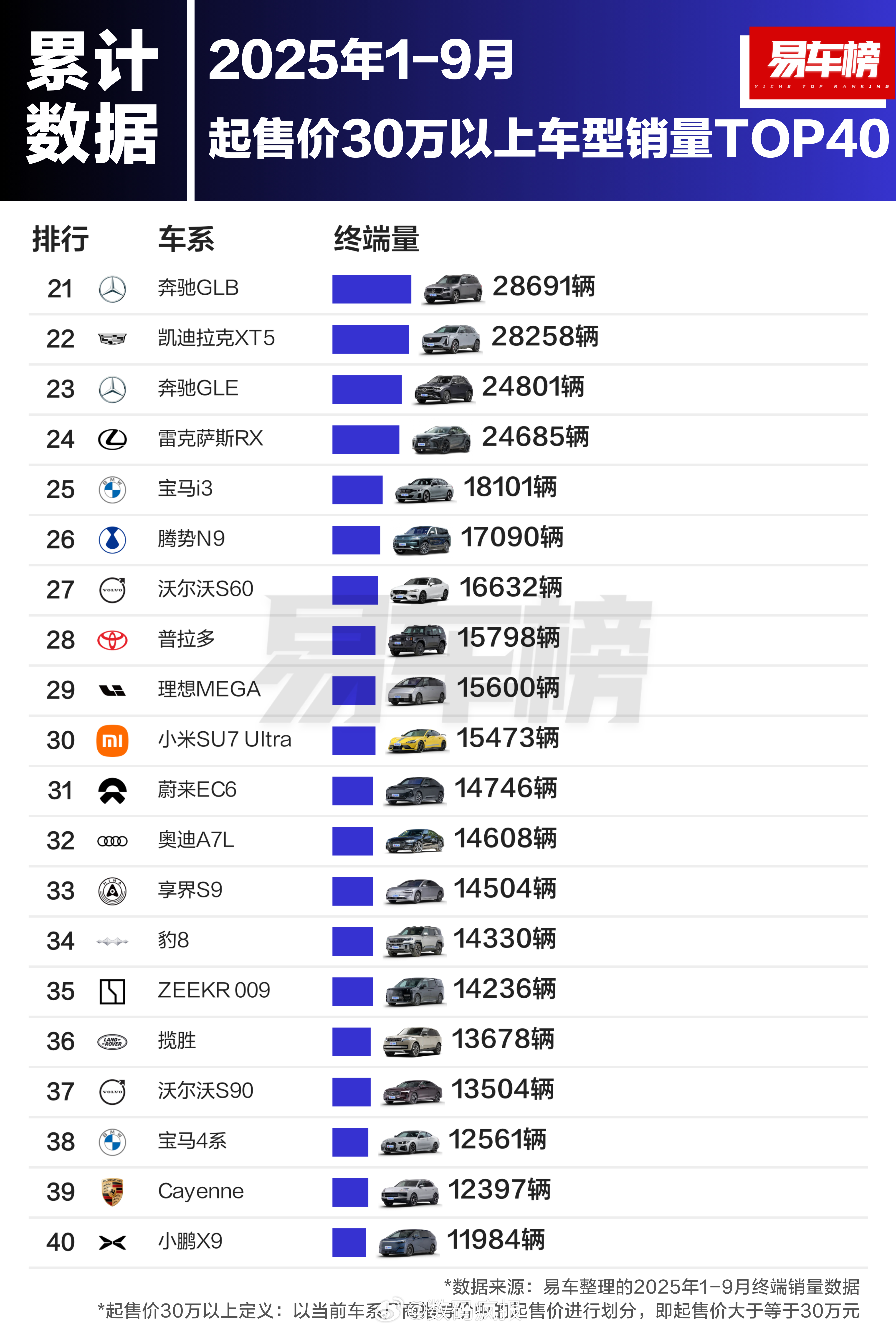 今年前9个月售价30万以上卖的最好的40款汽车,BBA还是很多,国产车努力努力
