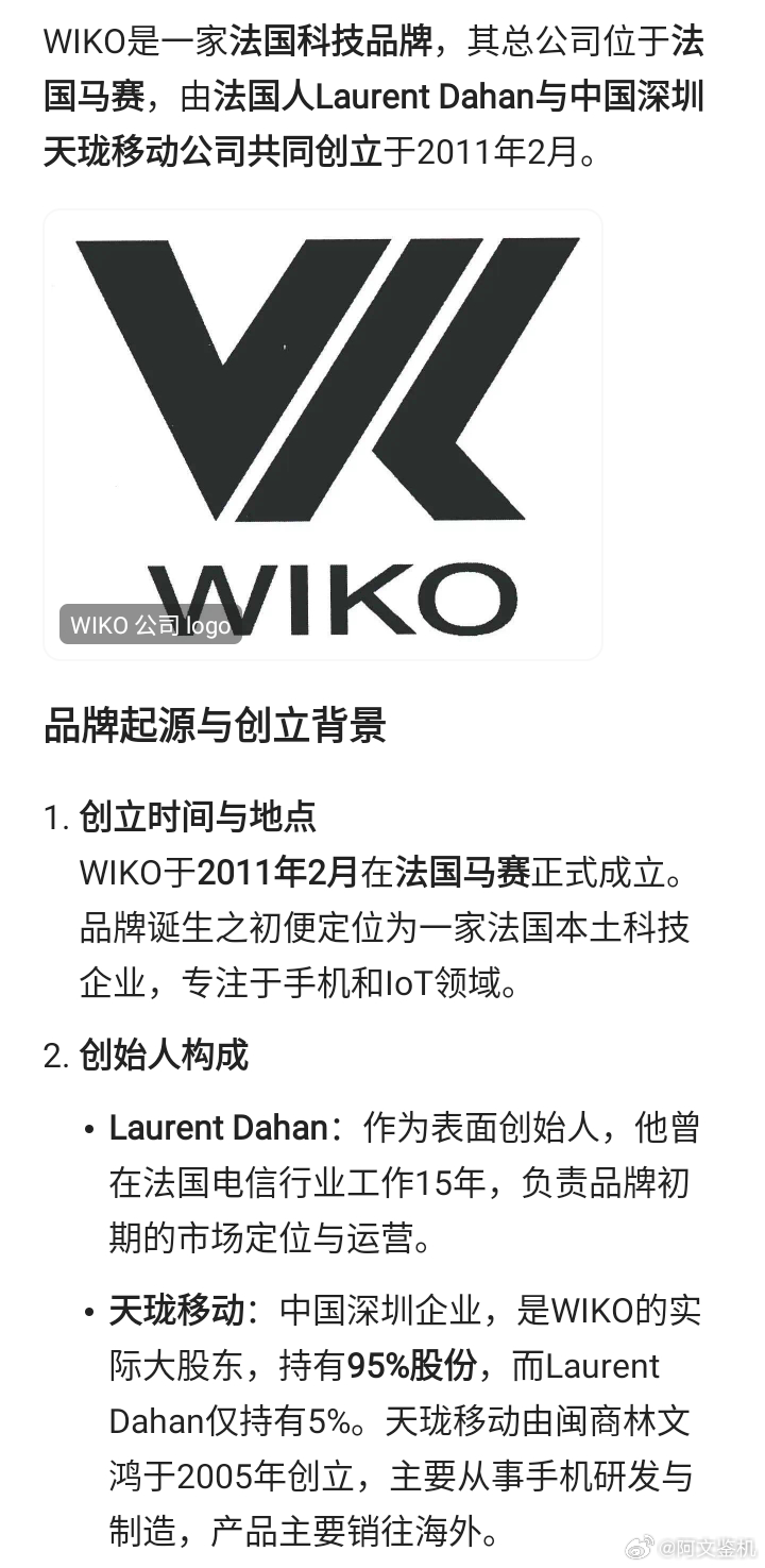 真不敢相信,这家来自法国的公司wiko,在国内已经卖了一千万台手机,我估计很多人可能听都没听过,有些销售内幕咱们就不提了,产品的表现大家可以去查查。这是wiko的信息,母公司在东莞,然后被天音控股夺走塔马希的“法国”品牌,国际官网还特别注明了中国的wiko和国际的不是同步发售。总公司是在法国,但实际控股公司是天珑移动。2017年天珑移动收购法国合作方的全部股权。2021年在东莞成立唯科终端技术。wiko的电脑能买,毕竟是华为的电脑换个标,手机买不了一点。和华为手机就不是一个东西,也不能用纯血鸿蒙。电脑两到三年内不会这样,电脑生态很难建立,所以大概率很长时间内都是两条腿走路,智选和鸿蒙电脑并行。