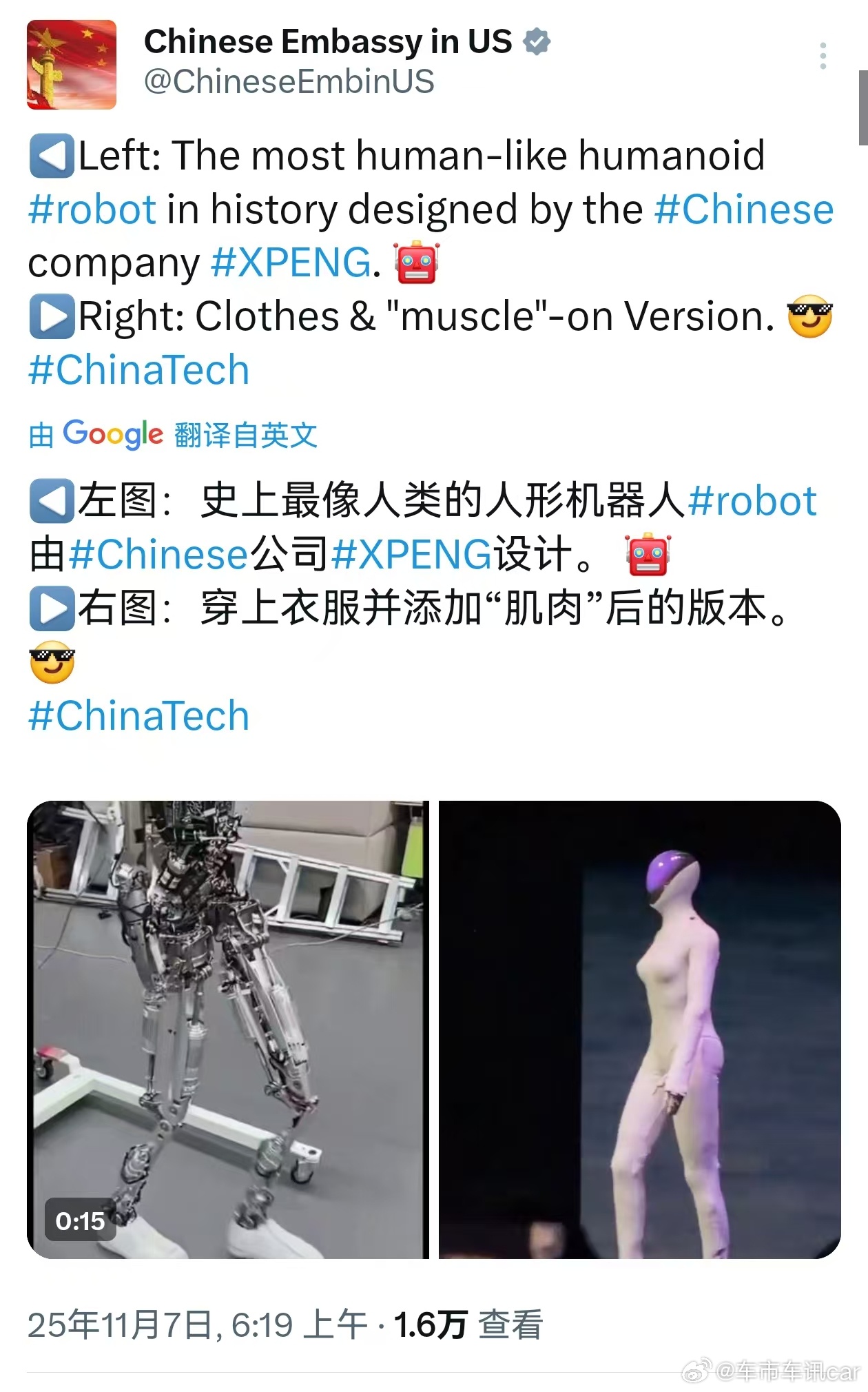 中国驻美大使馆点赞小鹏机器人何小鹏马斯克隔空互赞