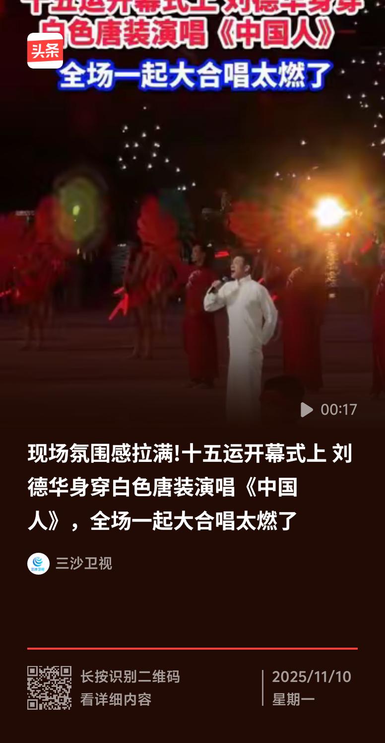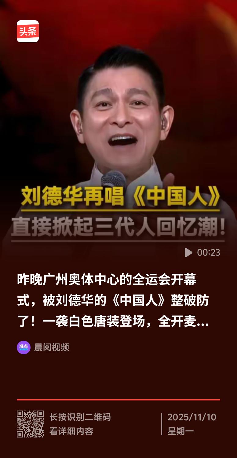 2025年11月9日,第十五届全运会开幕式上,64岁的刘德华作为压轴嘉宾登场,一曲《中国人》唱响,直接让国人的DNA动了。网上瞬间炸开了锅,“刘德华 提前解冻”这个词条直接冲上热搜。 在网友的“赛博设定”里,刘德华和玛丽亚·凯莉并称为“全球季节性解冻神曲”CP。只要刘德华一开嗓,大家就像被按下了春节启动键,都开始有了过年的感觉,难怪有人说“他歌声一响,国人的DNA都乱了”。不得不说,刘德华的歌就像一把钥匙,能打开大家心中关于经典和喜庆的那扇门。 刘德华 刘德华为何爆火