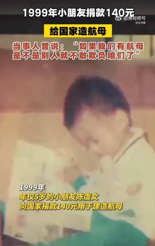 1999年小朋友捐款140元给国家造航母 据悉,1999年,一位名叫陈虞文的小朋友给国家捐款140元用于建造航母,有关部门专门回信退款并表扬他 今年已31岁的陈虞文在接受采访时表示,自己当时因看到北约轰炸南联盟而受到触动,心想“如果我们有航母,是不是别人就不敢欺负咱们了”。当时,5岁的陈虞文分4次捐出140元,给国家建造航空母舰。如今,我们已有三艘航母 不得不说,过去的爱国主义教育杠杠滴[赞] .