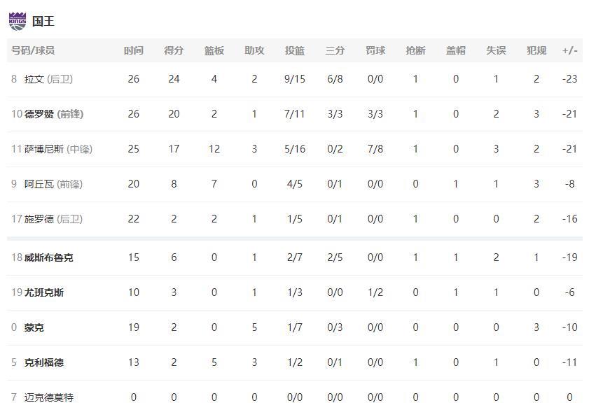 奇葩不?国王这队看数据真看不出烂在哪里。 3节落后27分,让森林狼得了111分,除了防守稀烂外(场均失分121.7倒数第3)我觉得下面因才是关键! 拉文、德罗赞俩外线核心,别看数据还行也能得分。可他们也只剩自己攻了,不防守外进攻端也不串联球队,更别说领导力了。 国王阵容真不差,差在这2大核不知道啥是赢球基因......