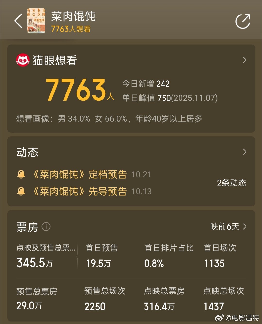 听听温特怎么说 沪语电影《菜肉馄饨》11月15日上映分线发行,这两天上海点映已经卖来快三百万了。在现在这个市场属实炸裂!比很多大明星的电影还能卖,这电影精准定位针对宣发,还有暑期的《夏雨来》都是区域电影确实不错的成绩。