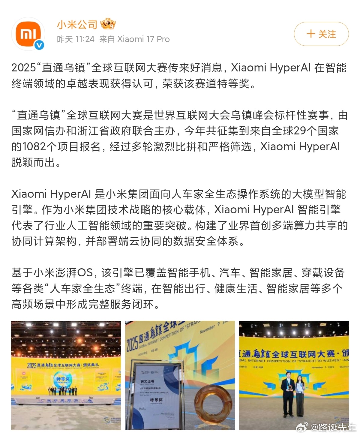 小米HyperAI获互联网大会特等奖小米HyperAI获互联网大会特等奖,还真是实至名归,因为HyperAI是基于小米澎湃OS的“人车家全生态”智能引擎。看见“人车家生态”,你就应该懂了。