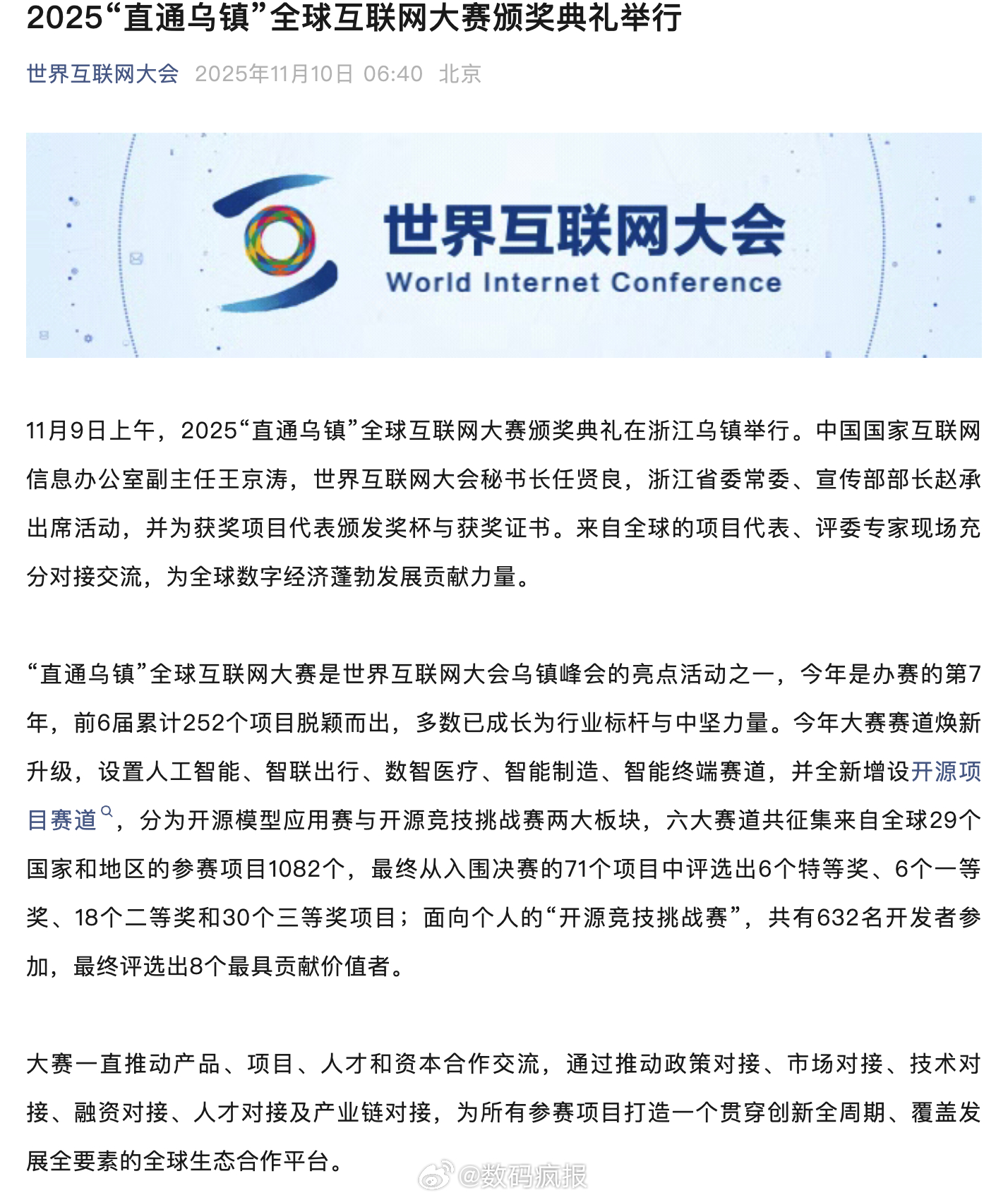 小米HyperAI获互联网大会特等奖11月9日,2025“直通乌镇”全球互联网大赛颁奖典礼举办,今年有29个国家和地区参与,参赛项目1082个!但是仅仅入围决赛的项目有71个,设置了人工智能,智能出行,智能终端等赛道,总共设立了6个特等奖、6个一等奖、18个二等奖和30个三等奖项目,值得注意的是,小米HyperAI拿下特等奖,而且智能智能终端赛道只要小米上榜,澎湃OS的AI能力挺可以的,又拿了一个奖[看书]