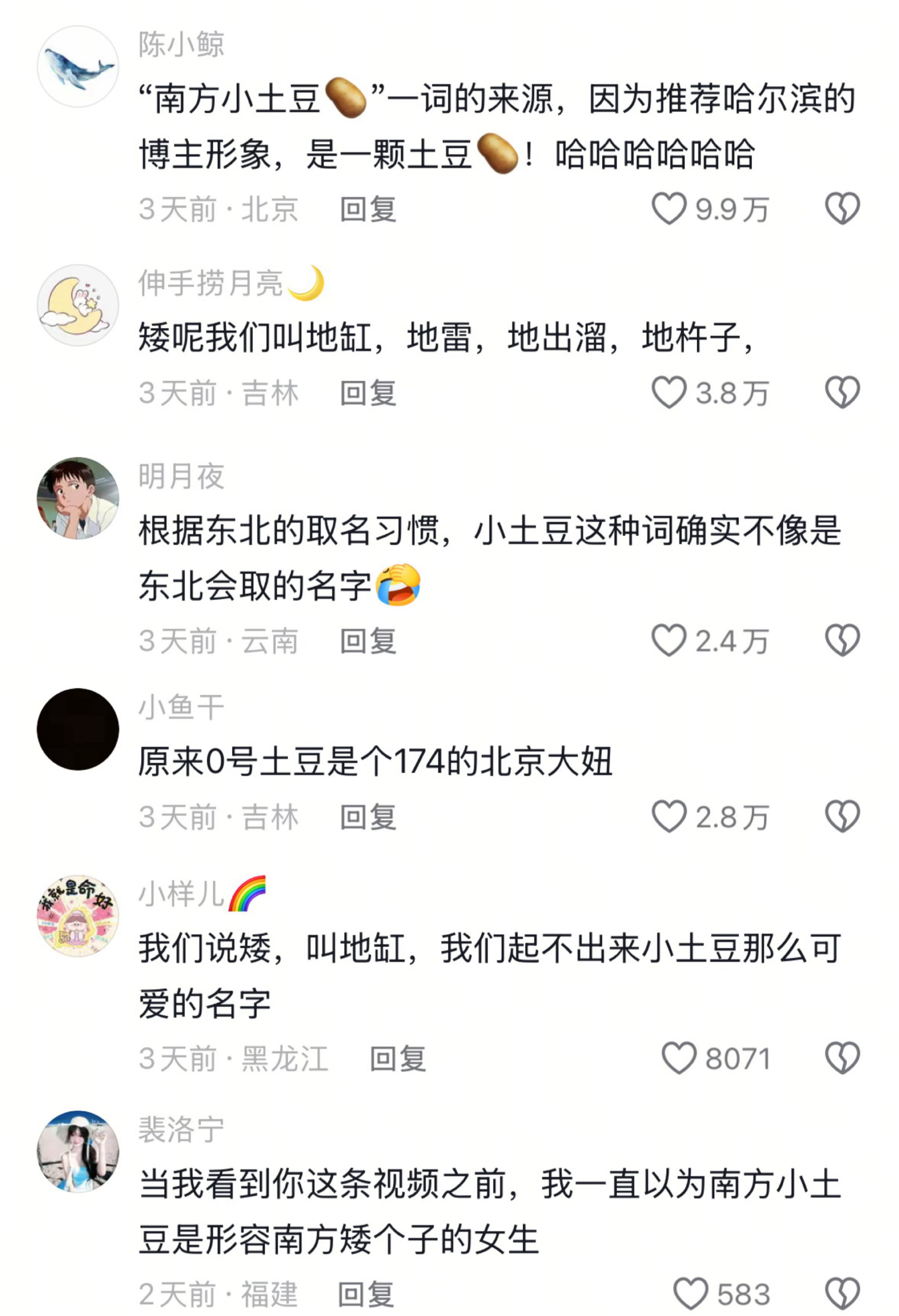 原来南方小土豆不是矮的意思,本身也就没往这块想过呀,一直想的都是比较可爱,是一种爱称[doge] 东北形容人矮,根本不会用小土豆这种说法,我们会叫“地缸”“矮冬瓜”“地出溜”