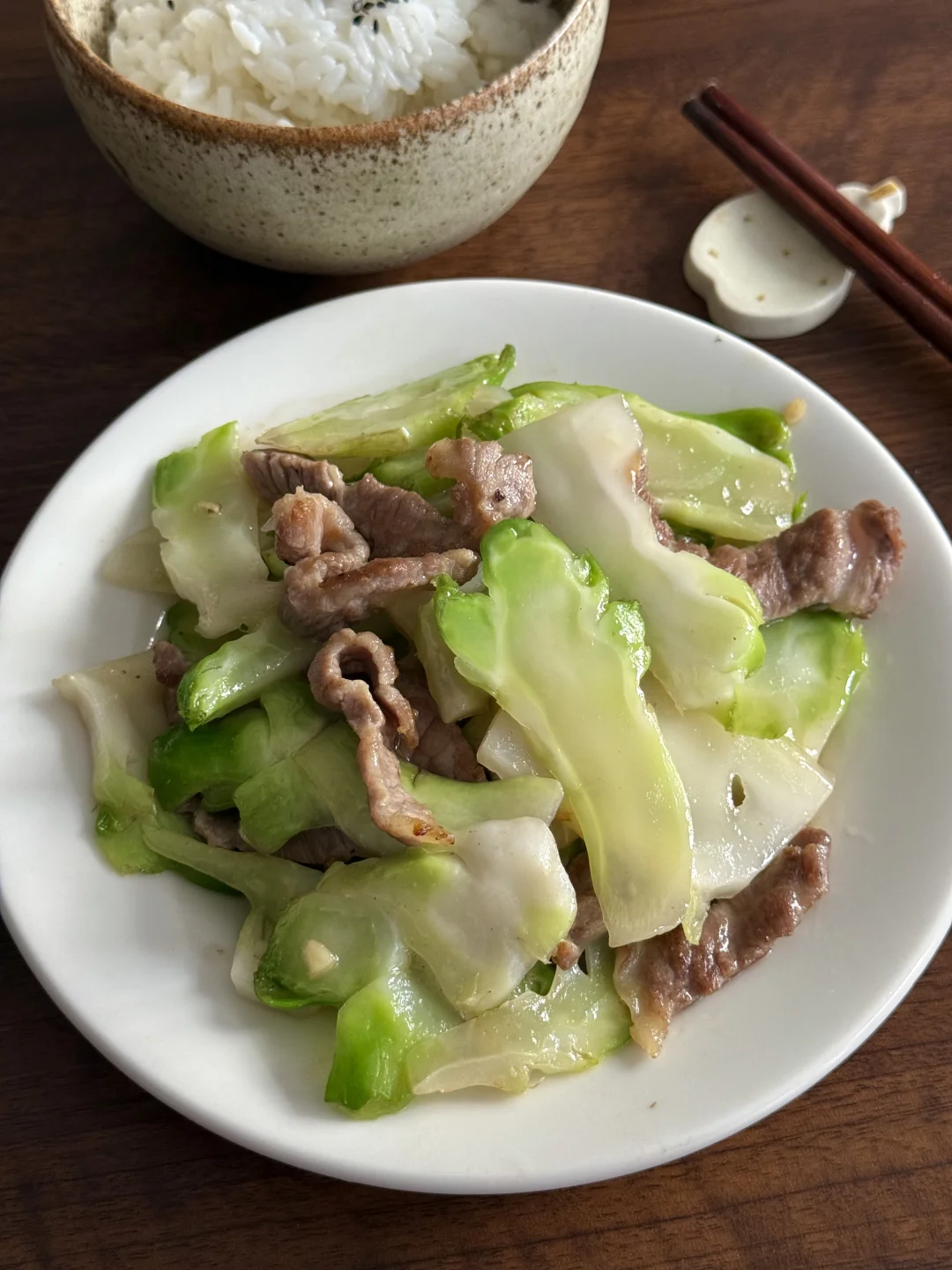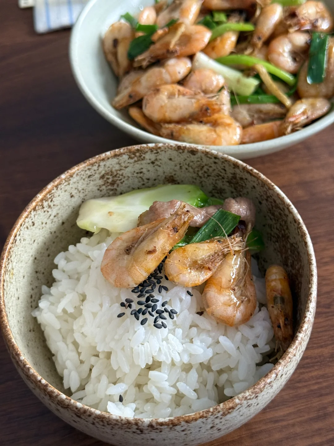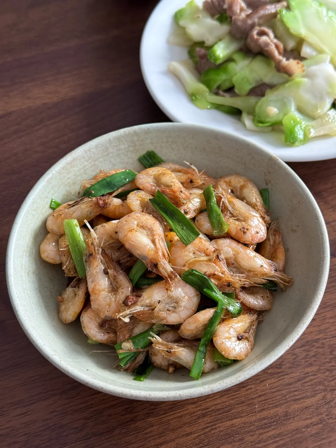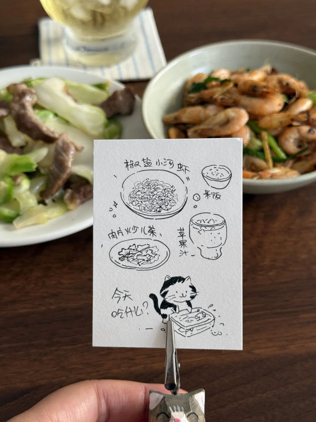 今日午餐分享:爆香小白虾,儿菜炒肉片,苹果汁,米饭