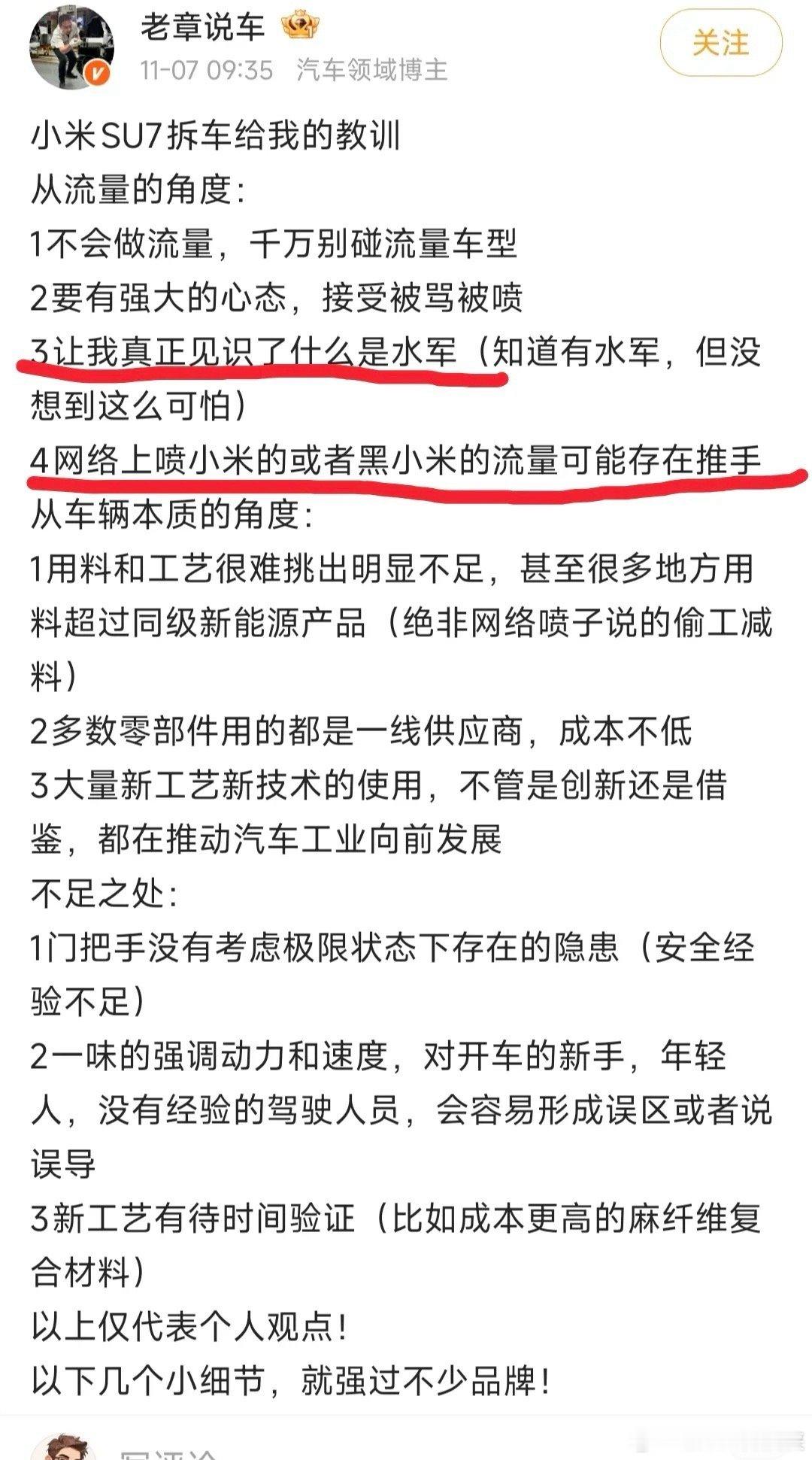 锐锐到觉得,网络世界大家都可以发表自己的意见,小米也不是不能喷,可喷也得讲事实吧?老章客观拆个小米SU7,就因为说了句用料实在,就被喷收钱了?现在有些人为点流量是真的不择手段。