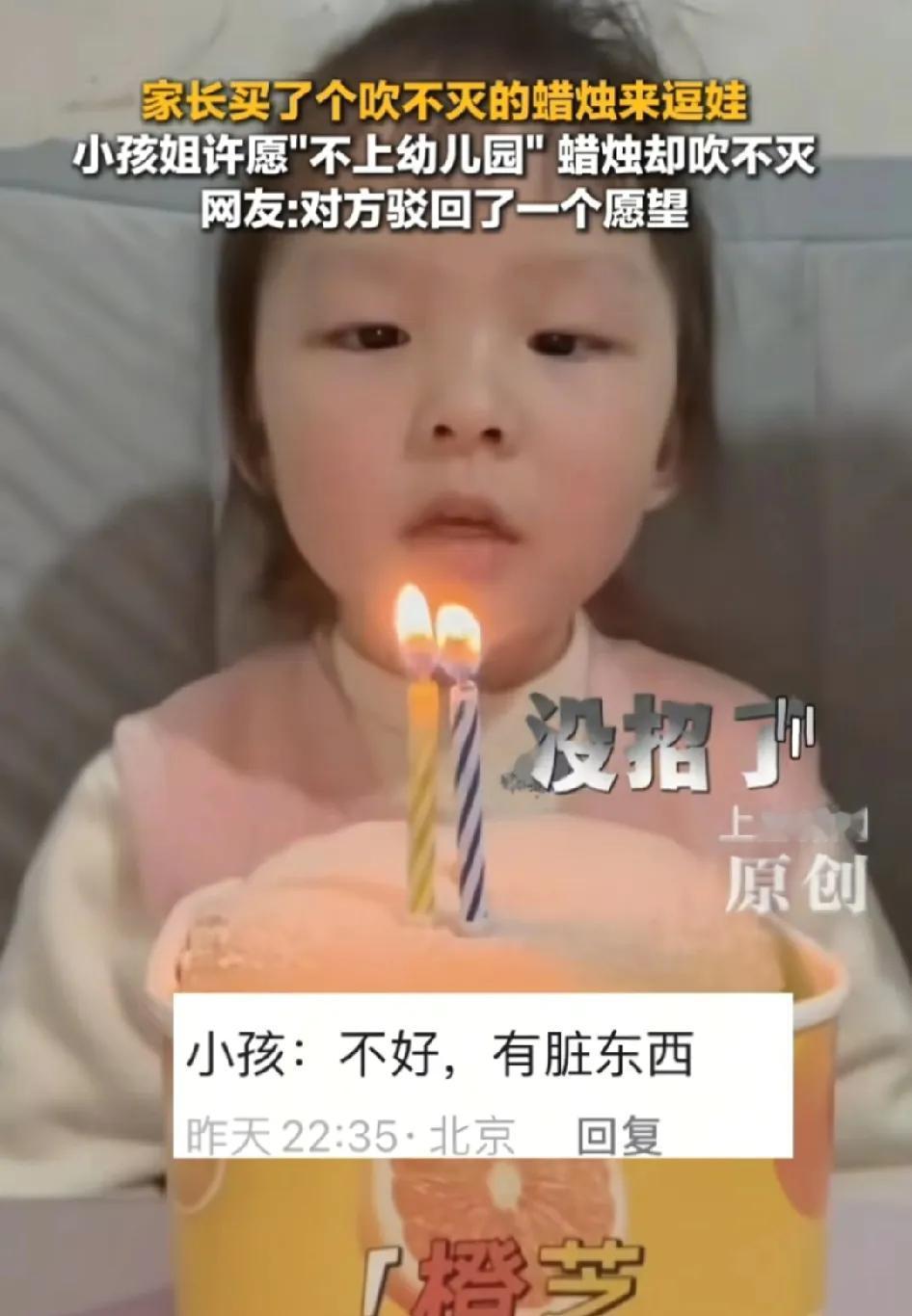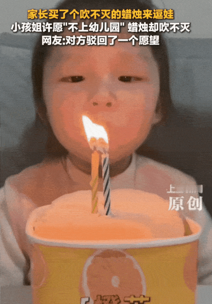 福建一个小女孩过生日时许愿不想上幼儿园,吹完蜡烛后发现蜡烛一直不断复燃,小女孩感到既好笑又困惑。 网友看了这个视频后纷纷说“还是孩子啊,许愿不想上幼儿园了还让它不断复燃”,并建议小女孩下次换个愿望,怕小朋友下次不许愿了。 其实不管小朋友许的什么愿望,都是代表他此时此刻的心声,上幼儿园都是孩子们刚接触的时候,都是有些抵触情绪也是正常的。 麻烦看官老爷们右上角点击一下“关注”,既方便您进行讨论和分享,又能给您带来不一样的参与感,感谢您的支持!