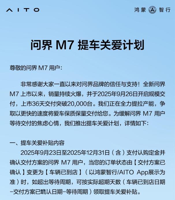 从交付保障到购置税兜底,全新问界M7 用“提车关爱计划”重新定义用户时间价值