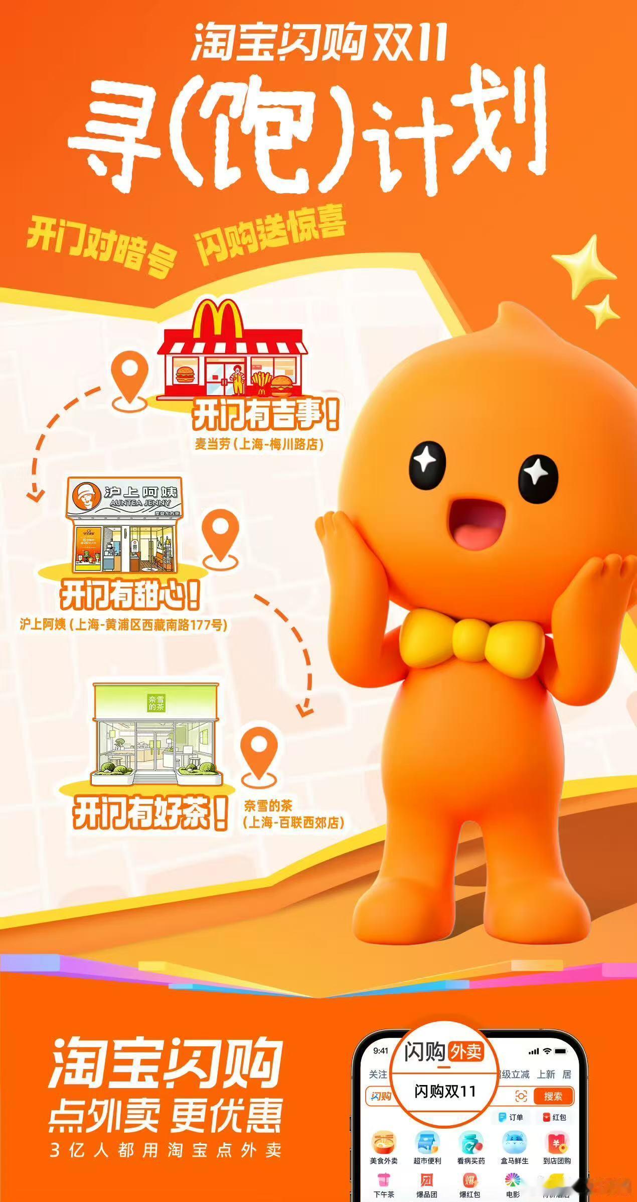 双11在淘宝闪购对上暗号了 淘宝闪购双11限量套餐 一代人有一代人的鸡蛋要领,00后们双11勇闯暗号局,大抢特抢淘宝闪购对暗号免单!来 线下指定门店加入“寻饱计划”,对暗号&抽签&做任务,抢免单赢周边,汉堡薯条甜筒奶茶随便炫,这才是干饭人的正确打开方式,立即开门加入战斗!来淘宝搜【闪购双11】,限定套餐11.11元起~ 淘宝闪购双11开门有惊喜