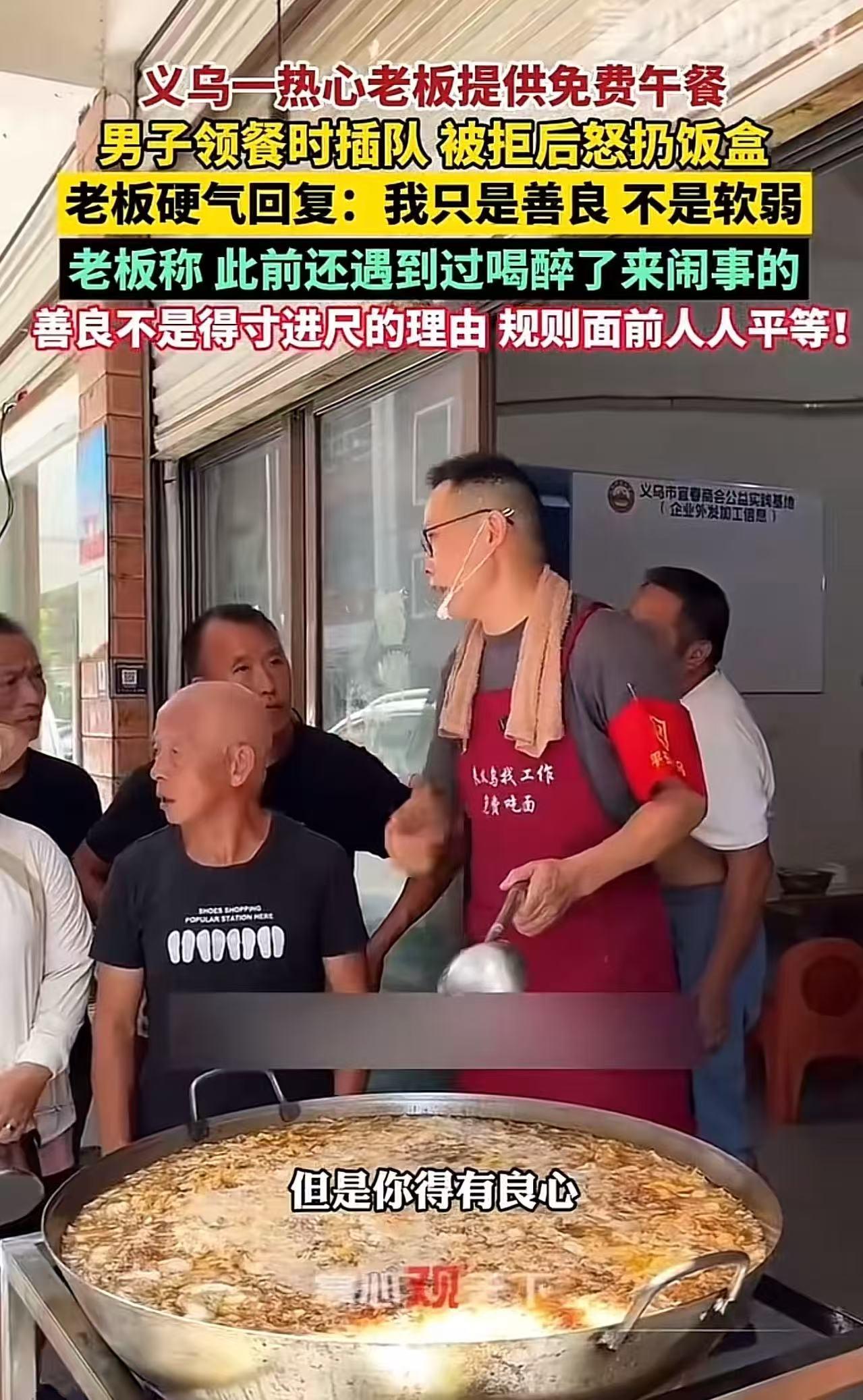 义乌,一热心老板提供免费午餐,男子领餐时插队,被拒后怒扔饭盒!老板:“你这种人不要来了,我只是善良,不是软弱!”网友:你的善良本是好事,是公德。但是无偿的施善,会养出一群不劳而获的懒汉来! 老板怀着一颗热忱的心,长期坚持做着一件善事——为环卫工人、外卖小哥、快递小哥以及来义乌找工作的人提供免费的面条或盒饭。 每天到了饭点,大家都会自觉地拿着空饭盒,规规矩矩地排起队,耐心等待着老板的饭菜出锅。现场秩序井然,每个人脸上都带着期待和感激。 可是,,男子来到领餐处后,压根儿没把排队的规则放在眼里。他瞧着周围排队的人老实本分,便大摇大摆地直接插队到了第一个位置。 老板看到这一幕,赶忙上前制止,严肃地对男子说:“麻烦你去后面排队,大家都得遵守规则。” 男子却满不在乎,还理直气壮地声称自己饿得不行了,让老板先给他打饭。 老板再次坚定地拒绝了他,并说道:“你要是这样插队,以后就别来了……” 没想到,男子听到这话,不但没有丝毫羞愧,反而硬气地转身就走,还气呼呼地把饭盒狠狠扔在地上。 老板见状,气坏了,说:“我免费给你饭吃,也没指望你谢我,人可以坏,也可以好,但起码得有点良心吧!” 男子却满不在乎地丢下一句:“反正我明天不去你那里吃饭……” 其实,老板对这个男子并不陌生。之前有一次,这男子喝得醉醺醺地来了,一来就插队,还一下子拿了两个鸡蛋吃。 当时他可怜巴巴地说自己饿坏了,老板心地善良,便理解了他。 可谁能想到,这男子不但不领情,反而还指责老板煮面的速度太慢。 老板觉得莫名其妙,就问他什么意思。这男子居然大言不惭地说自己很“牛B”。 老板忍无可忍,说道:“你牛B就别来我这里耍威风,我只是善良,可不是软弱可欺!” 本以为经过那次,这男子会有所收敛,没想到这次他又故技重施…… 此事引发热议,有网友说,老板的初衷是好的,但这种免费的,没一个能搞长久的,你会遇到各种形形色色的人,最终结果就是老板崩溃,从心凉到心寒最后心死。不要考验人性,人性是最经不起考验的。 也有网友说,吃免费的东西还这么有底气?免费应针对特定人群,像这种健健康康,手脚齐全的不应给他免费! 还有网友说,就是因为有这种人,让真正需要帮助的人得不到帮助! 善良是一种难能可贵的美德,老板免费为他人提供午餐的善举,本应得到尊重和赞扬。然而,像这位男子这样插队、无理取闹的行为,却是对善良的亵渎。 无偿的施善,绝不能成为滋养不劳而获者的温床。如果对这种行为不加制止,任由其发展,那么善良最终可能会被利用,真正需要帮助的人可能反而得不到应有的援助。 社会需要善良,但更需要规则来守护善良,让善良不被滥用,让每一个付出善意的人都能得到应有的尊重!