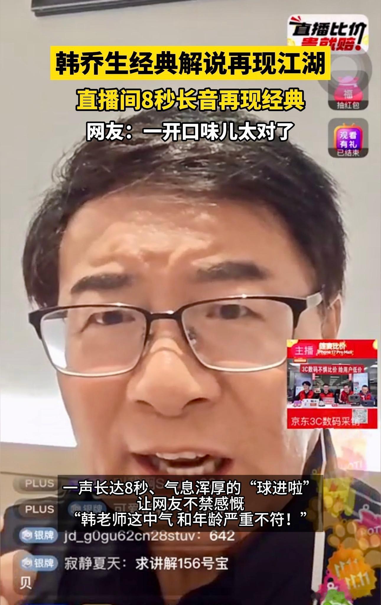 身为体育解说员、评论员,韩老师多年以来堪称“现象级”,微博名叫“大嘴韩乔生”,就是他最显著的标签。昨晚连麦京东直播间买3C好货,他的一个8秒长音儿,依然底气十足,给直播间整出了不一样的动静,也让板板正正的数码产品销售,忽然多了烧脑、跳跃、逗乐儿、拍大腿的元素。