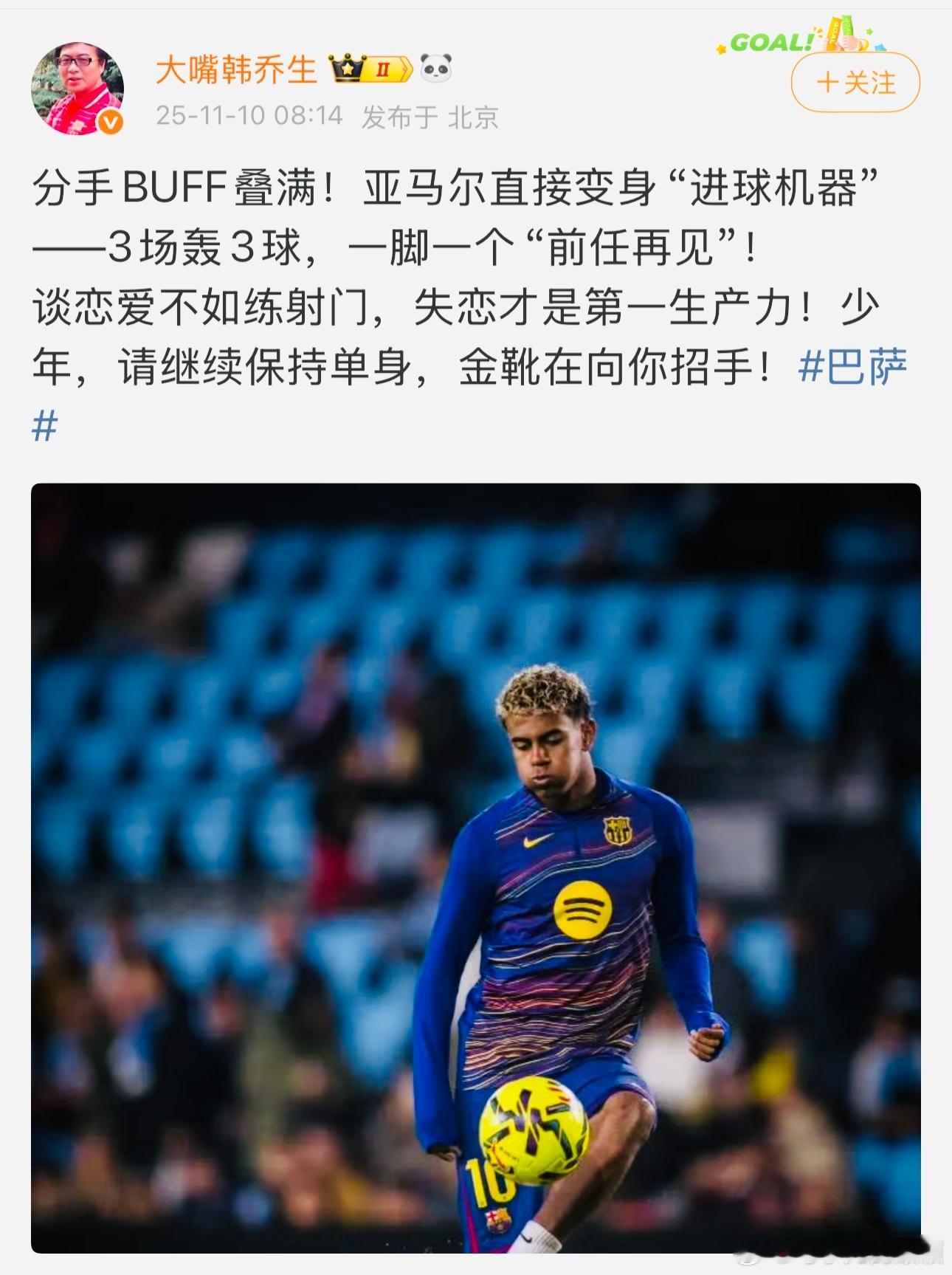 看韩乔生连麦跟直接看球没区别韩乔生老师在微博上很活跃,今天上午发的一条,是关于亚马尔的——3场轰3球,谈恋爱不如练射门,失恋才是第一生产力……毫无疑问,这就是大家熟悉的,韩老师的风格。