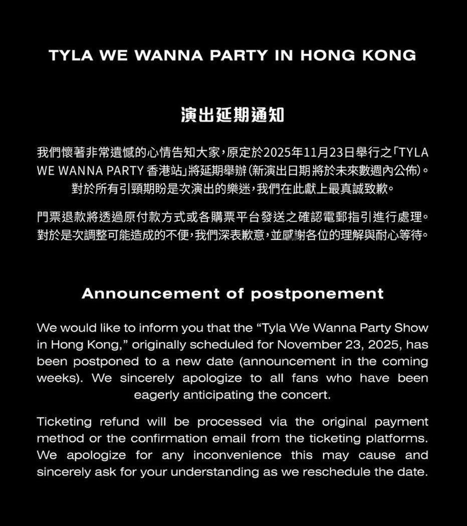 Tyla 首次亚洲巡演香港站延期,将自动退款! Tyla 宣布计划于11月23日举办的 We Wanna Party 香港站演出延期,通过网络平台购买的票将自动退款。 确切的演出日期及细节将于未来数周内在官方社交媒体账号公布,重新安排时间,重新进行售票。 任何未经本公司同意转售或转让的门票,本次退票安排产生的纠纷,均与主办单位无关。 对于已定机票和酒店的外地粉丝,官方无赔偿的责任,没有义务为你造成的损失进行赔偿。 如果你已经买了飞往香港的机票,以及订了香港的酒店,主办方祝你在香港享受一个快乐的假期。