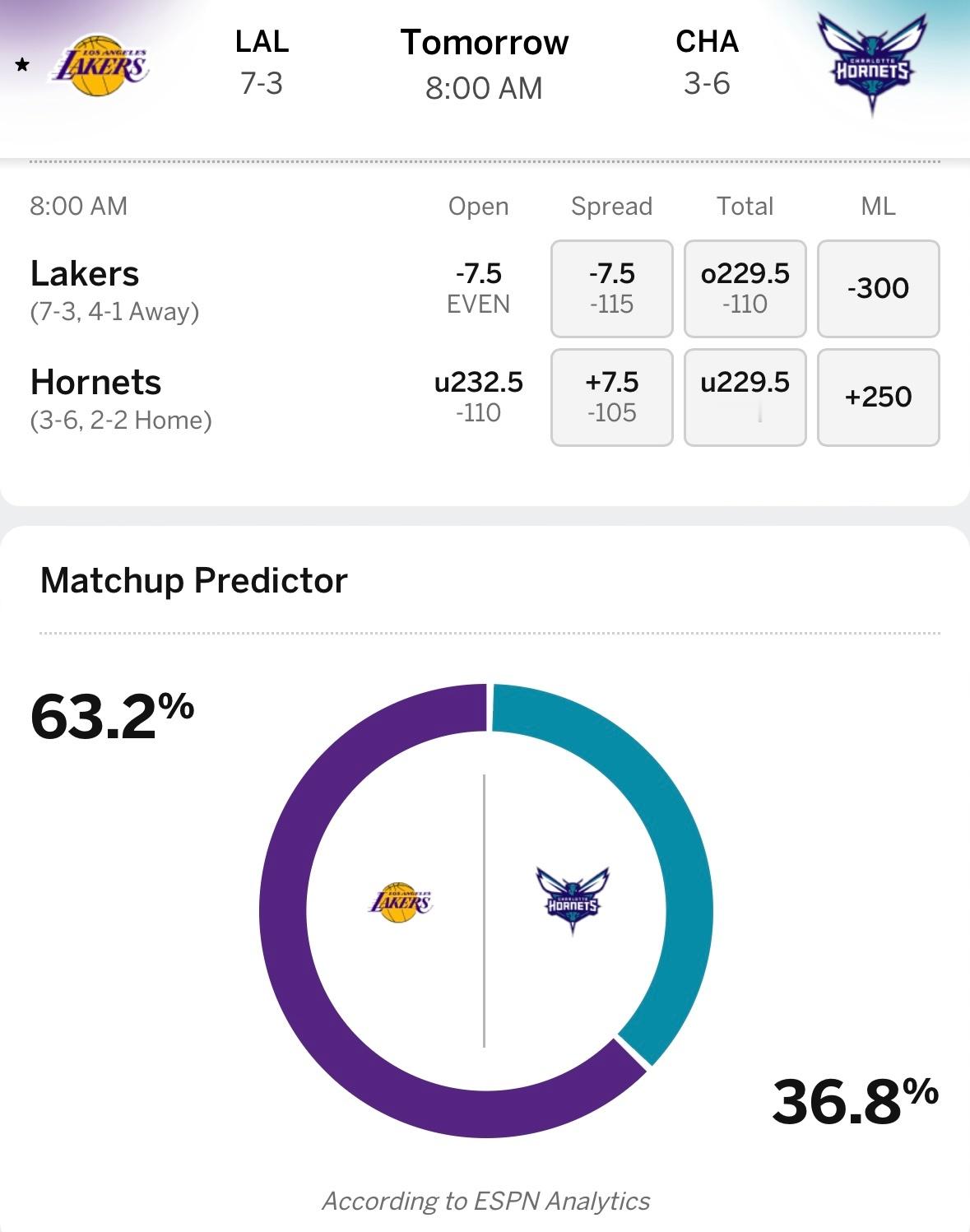 湖人明日8点客场对阵黄蜂,ESPN给出获胜概率:湖人63.2%、黄蜂36.8%。