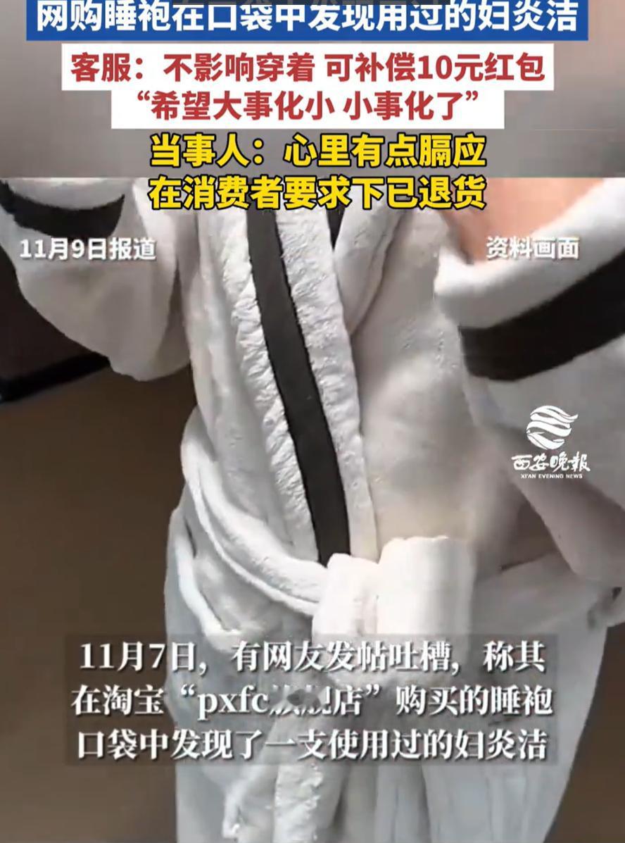 “太离谱了!”女子在网上买了一件女士睡衣,试穿时却从兜里摸出一个妇炎洁,而且还是打开使用过的,女子找到网店讨要说法,可对方却表示不影响衣服的使用,愿意补偿10元的红包。这也让女子相当不满 女子介绍,当时收到快递后就准备试穿看一下大小是否合适,可穿上身后却发现兜里有些重量,伸手一摸发现有个小东西,拿出来一看还以为是眼药水,可再一看上面写着的“妇炎洁”三个字,她立刻就知道了这是什么,同时对衣服也是相当厌恶 女子第一反应就是联系卖家。结果客服一句话把她气笑了,对方承认是检查时出现纰漏,但不影响衣服穿着,补偿10块钱红包。她当即拒绝,坚持退货 说实话,这虽然是个小事,但换谁遇到了心里都不会舒服,而且也暴露了网购中一个很重要的问题,那就是二次销售 很多商家为了节省成本,把退回来的衣服重新包装再卖。问题是,谁也不知道上一位买家干了什么,哪怕是一次简单的试穿,也可能留下污渍、气味甚至私人物品。消费者掏钱买新的,结果拿到“旧”的,心理落差自然大 而在这件事上,客服那句“不影响使用”才是问题最大的的。商品不是只讲能不能用,更讲究“干不干净”“安不安全”。一件贴身衣物出现使用过的私人物品,早就不是“能不能穿”的问题,而是卫生和信任的问题。10块钱补偿不了恶心,更弥补不了信任被破坏的感觉 睡衣毕竟贴身衣物,不是手机壳,不干净就是不能卖,商家真的要在未来注意一点