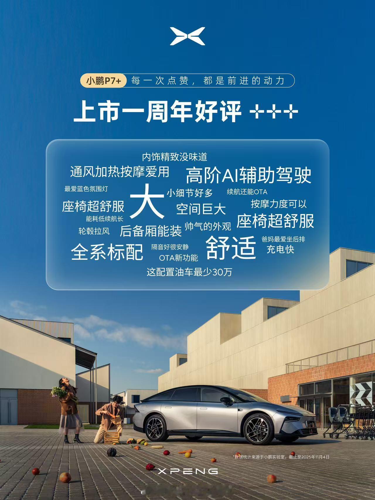 小鹏P7+上市一周年,累计交付突破85,000台,月月销冠,领跑20万级纯电市场。 全球首款AI汽车,续航OTA升级,智驾渗透率99%,累计行驶超2亿公