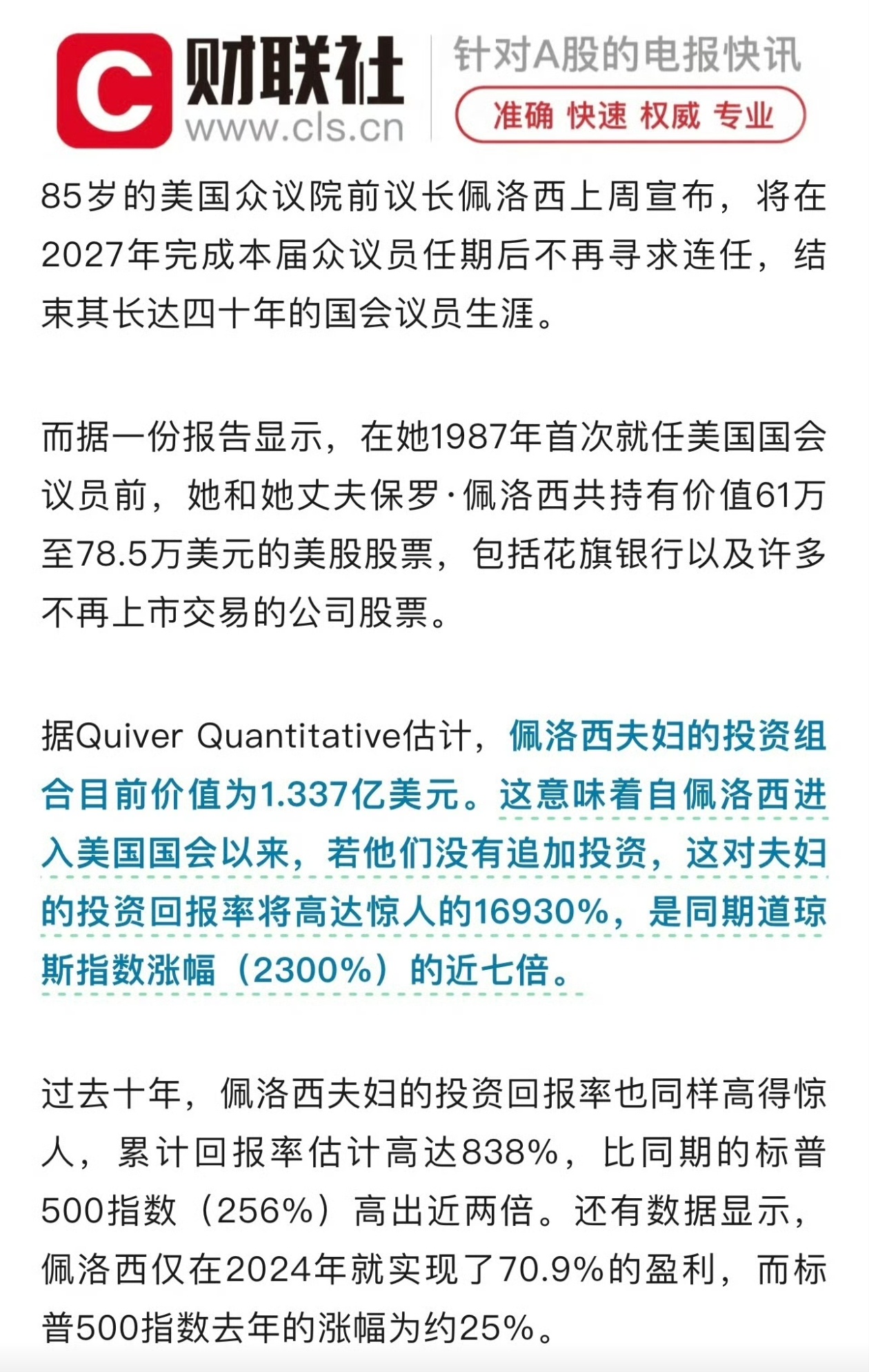佩洛西炒股炒成亿万富豪 当了四十年国会议员,佩洛西与她丈夫的股票投资回报率达到了惊人的16930%。