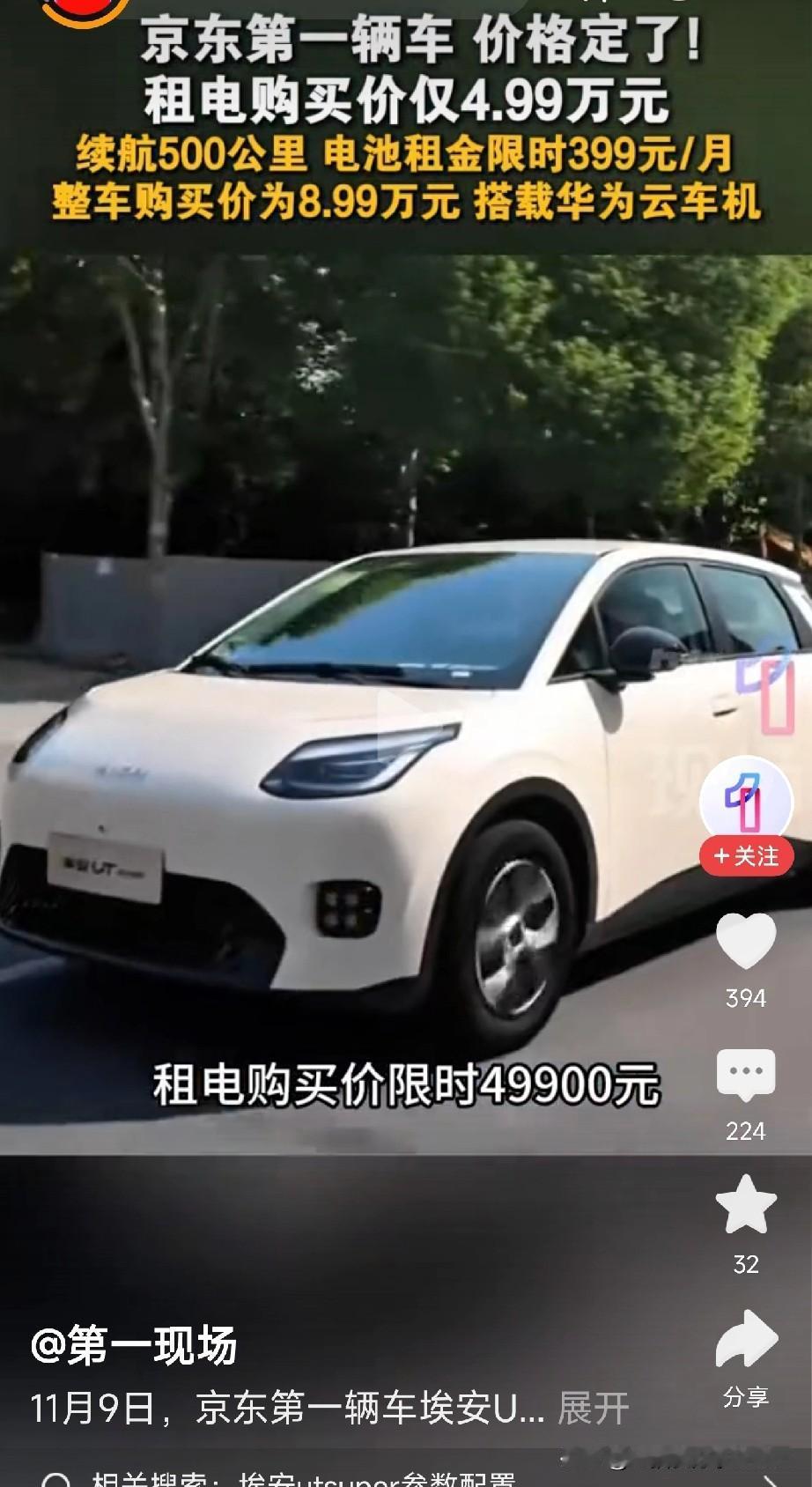 京东首辆车杀到! 京东第一辆车真的来了! 埃安UT super正式上市,租电购买价只要4.99万,整车购买价8.99万。这价格,直接捅破电动车底价! 续航500公里:搭载宁德时代巧克力电池,通勤一周充一次电够够的。 换电99秒:比加油还快!进站换块电池,比等红绿灯时间都短。 电池月租399元:限时优惠,3年内买断电池,已付租金还能全额抵扣。 配置不“丐版”,智能拉满, 华为云车机系统+14.6英寸大屏,手机互联、语音控制全支持。 轴距2750mm,后排能跷二郎腿,空间碾压同级。 540度全景影像+倒车哨兵功能,新手秒变老司机。 全国3000+京东养车门店、4万家合作网点,维保比传统4S店更省心。 180天价保承诺,买贵赔10倍差价,买车像买手机一样放心。 到底值不值? 网友吵翻了 支持派:“4.99万要啥自行车?续航500公里+换电,城市代步神车!” 观望派:“月租399元+电费,长期成本和油车差不多,电池还不是自己的?” 真相区:适合通勤族、首购年轻人、充电不便的老小区居民。 如果你预算有限、想要长续航又怕充电麻烦,这车可能是5万级最优解;如果你常跑长途、介意电池产权,油车或许更稳妥。 (文章素材来自第一现场,侵删) 这价格能否改写电动车市场格局?评论区聊聊你的看法!