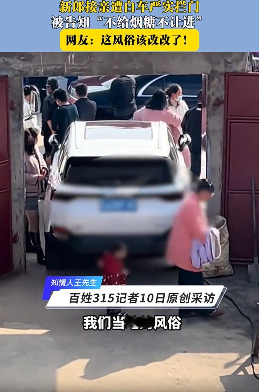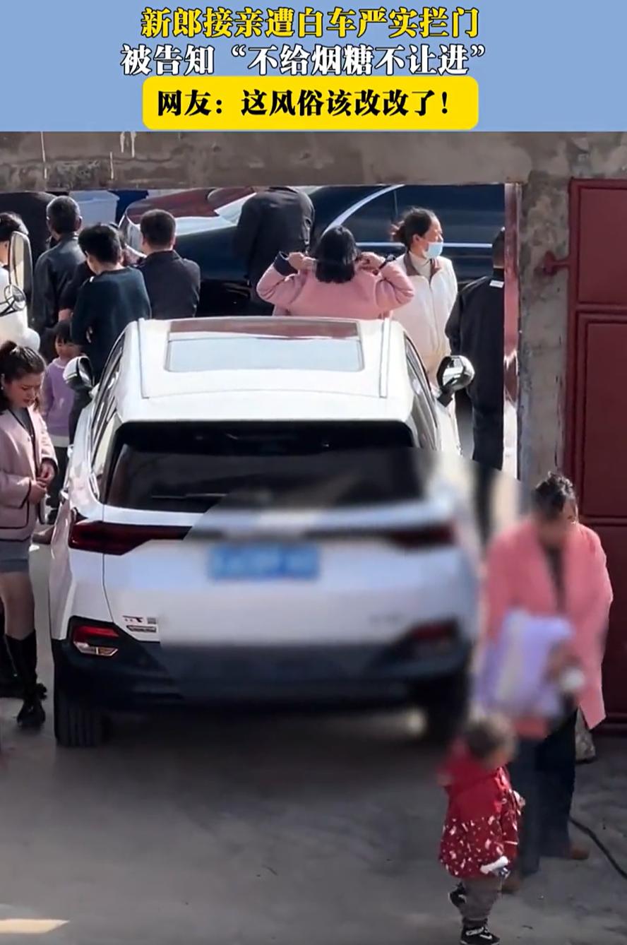 江苏宿迁,一对新人结婚,新郎高高兴兴去接新娘,结果刚到门口,就被一辆白色越野车拦住了去路。车子严严实实地堵在大门前,旁边有人喊着:不给烟和糖,就别想进门!网友:我要是新郎,转头就走! 现场视频里,能看见亲友们围在四周,有人边拍边调侃:这下新郎可真进不来啦。事后,视频拍摄者也解释说,这是叫“拦门”,就是不让新郎进去,是要喜烟喜糖的,这是我们当地的风俗,必须要给喜烟喜糖才给进,不然不给进 对此,有网友表示:这算什么风俗,这就是妥妥的陋习 其实,“拦门”这习俗在很多地方都有,初衷是图个热闹,增加接亲过程的趣味性。要几包烟、发点糖,本来是个形式,沾沾喜气也就过了。可一旦做过了头,把热闹变成了为难,把心意变成了硬性要求,味道就变了 风俗这东西,讲究的是情趣和分寸。老一辈留下来的规矩,本是希望婚礼多点笑声和热闹,可放在如今,有些做法的确该换个方式。现在大家更注重体验,婚礼成了两家人的面子事,不是谁比谁更会整活。堵门讨喜糖没错,可要是搞得像设卡拦车,反而容易让人反感 真正好的婚俗,是让大家都舒服,而不是单方面为难某一方。比如有些地方,拦门只是象征性地让新郎唱首歌、回答几个问题,热闹一下就放行;也有些家庭会提前沟通好,避免出现尴尬场面。这些做法既保留了仪式感,又不失人情味