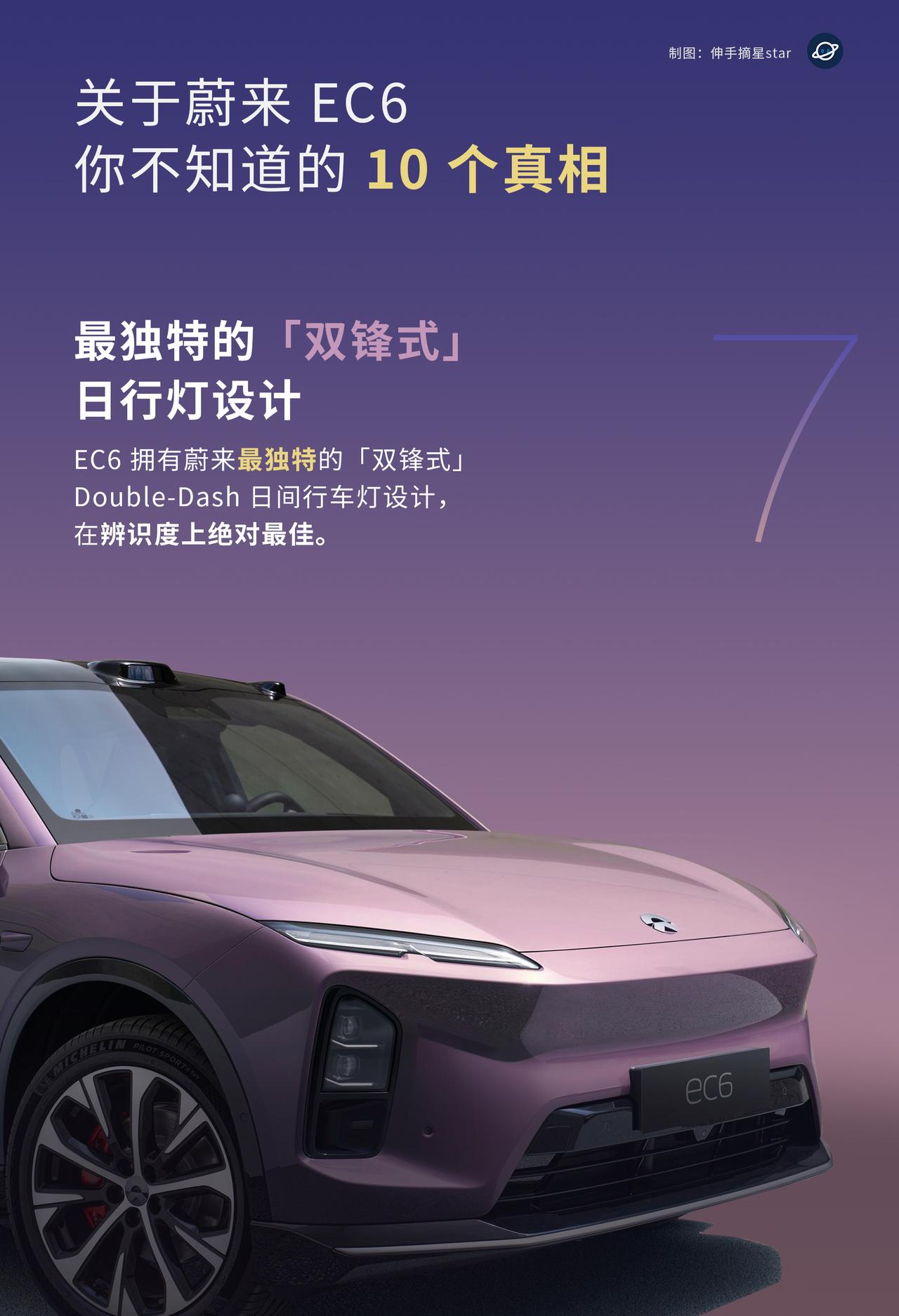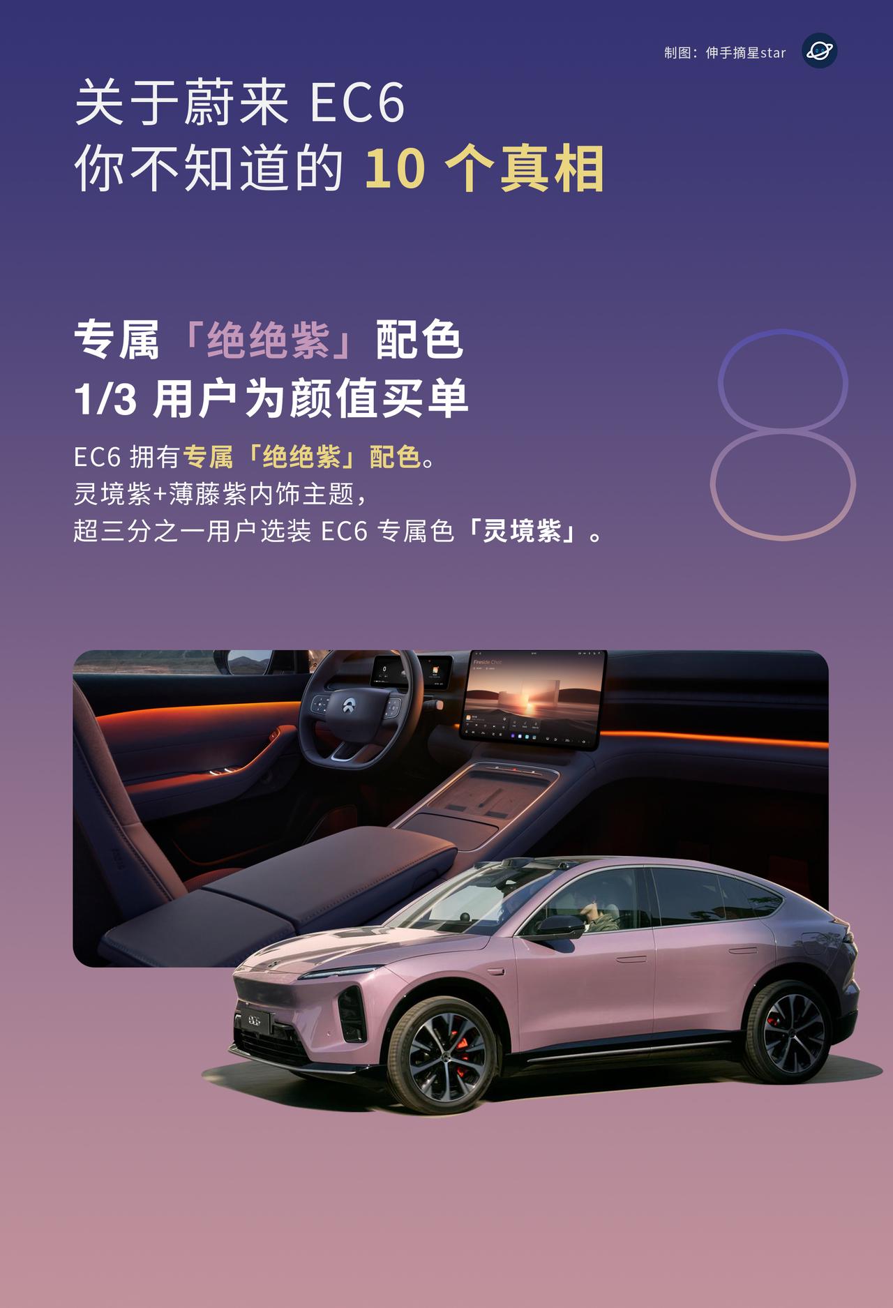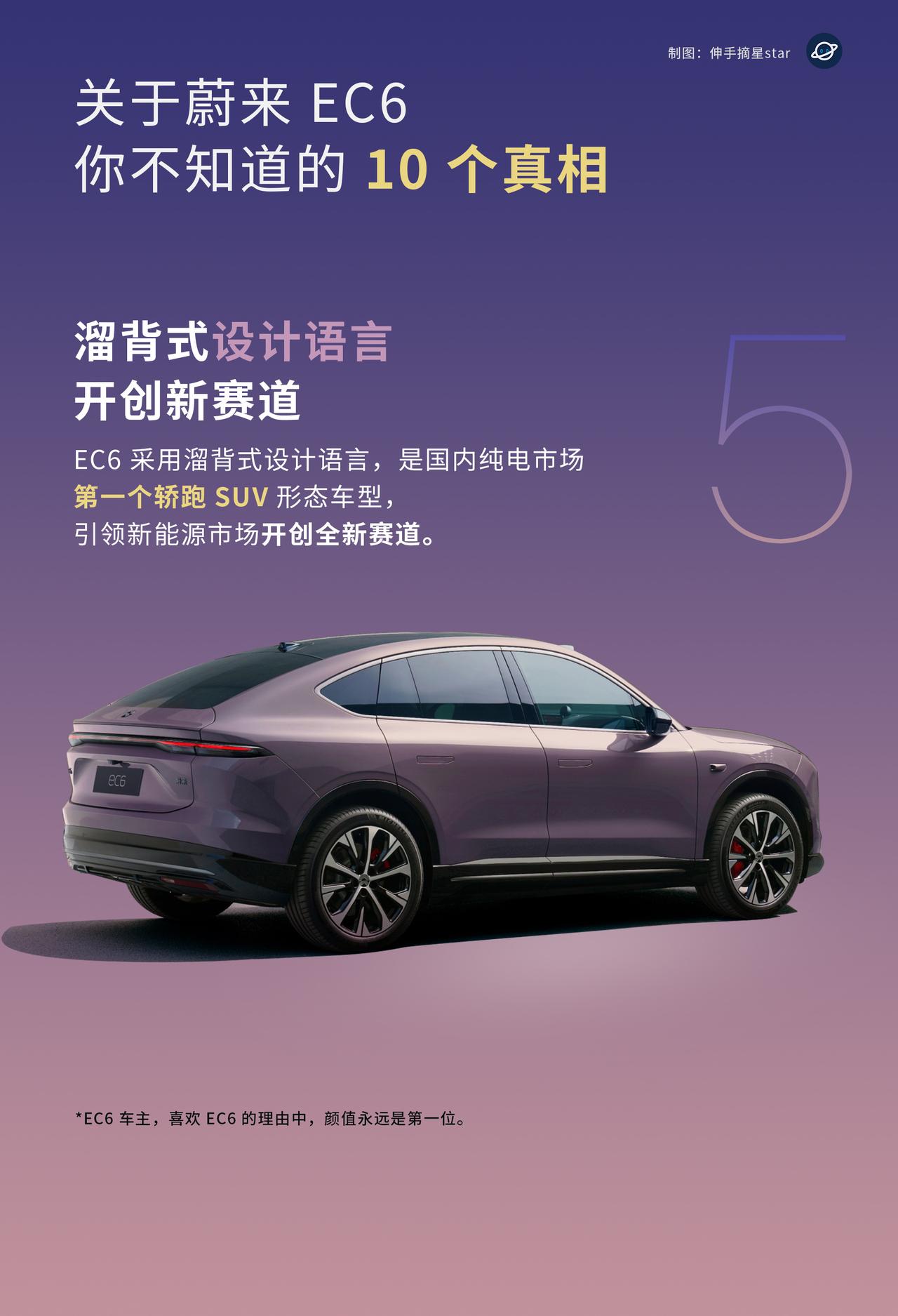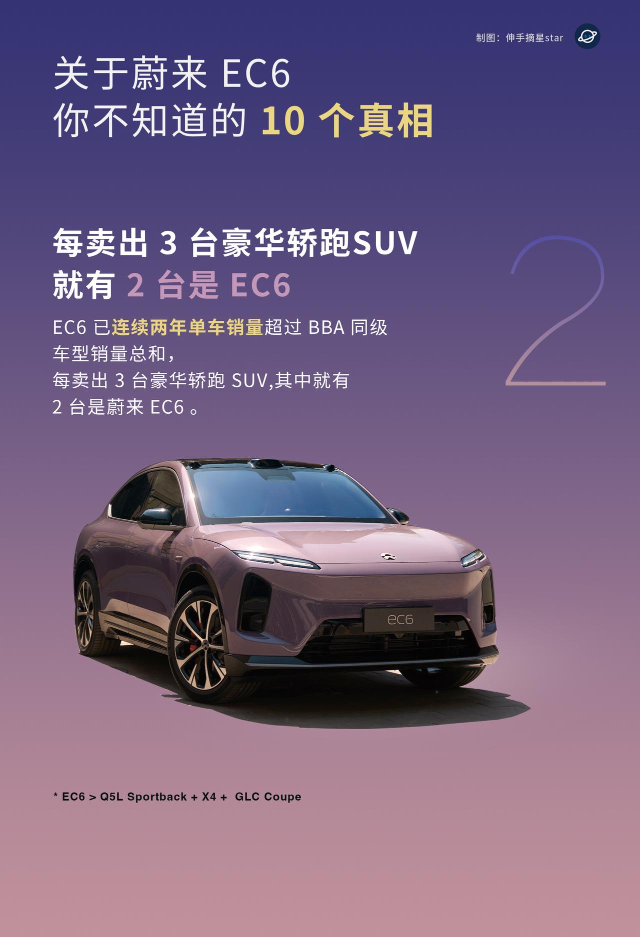 EC6,你知道的是颜值高, 轿跑造型惹人爱。 EC6,你知道的是蔚来的小众车型, EC6的车主漂亮小姐姐N多。 你是不是没有想到, 蔚来把小众成为了主流。 蔚来EC6的销量超过了同级BBA的总和。 根据聪明的“车友”@蔚来的杨波 分享的 文字版本: 关于EC6,你不知道的10个真相, 我把它具象化了。 当然,还会有更多的真相大白, 欢迎评论区补充。 蔚来 颜值高的车 蔚来ec6新能源汽车