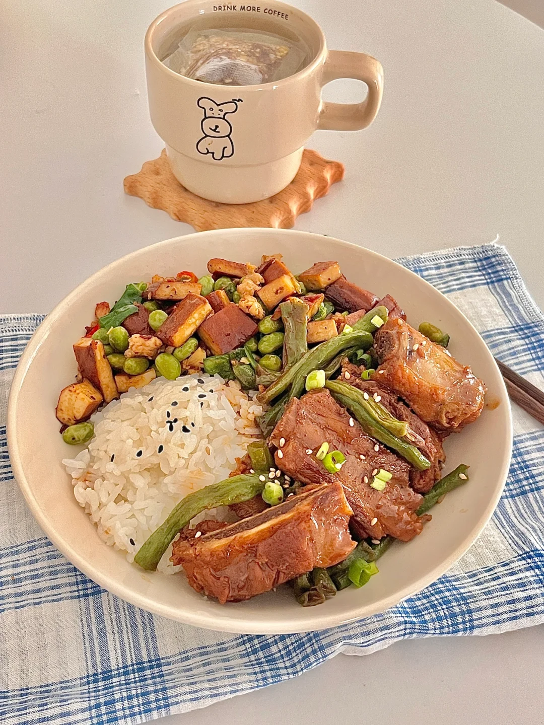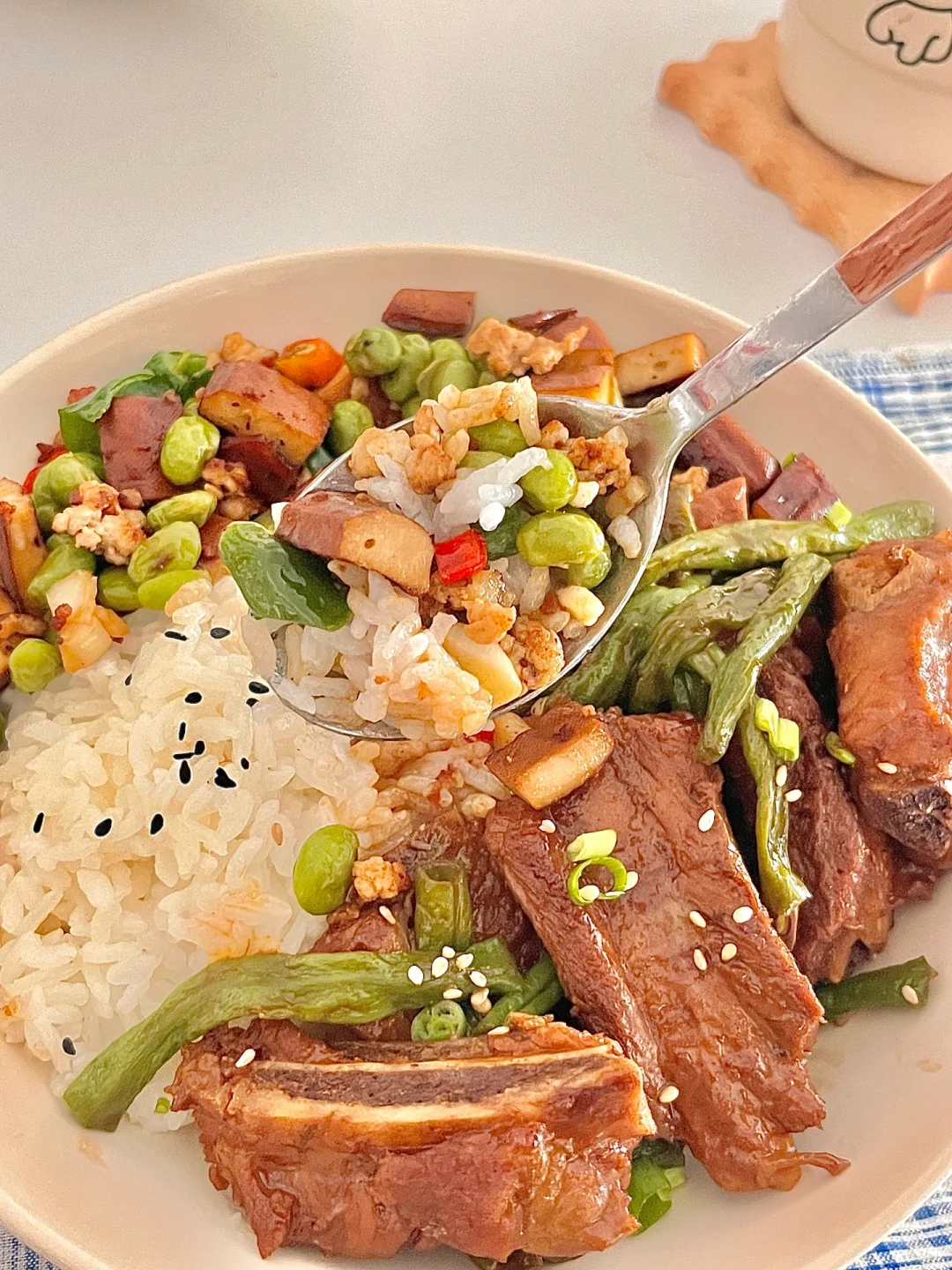 做菜我是认真的 太爱吃我做的减脂餐啦,今天吃排骨烧豆角🥩毛豆香干炒肉沫~ 排骨和豆角简直是天作之合,排骨炖煮得软烂,豆角充分吸收了排骨的汤汁,绵软又入味。 毛豆、香干和肉沫的组合太哇塞了,拌米饭吃简直了~ 食材🥬:排骨 姜片 豆角 香叶 八角 毛豆 香干 小米辣 蒜末 青椒🫑肉沫 做法再图上⬆️你们也去试试吧~