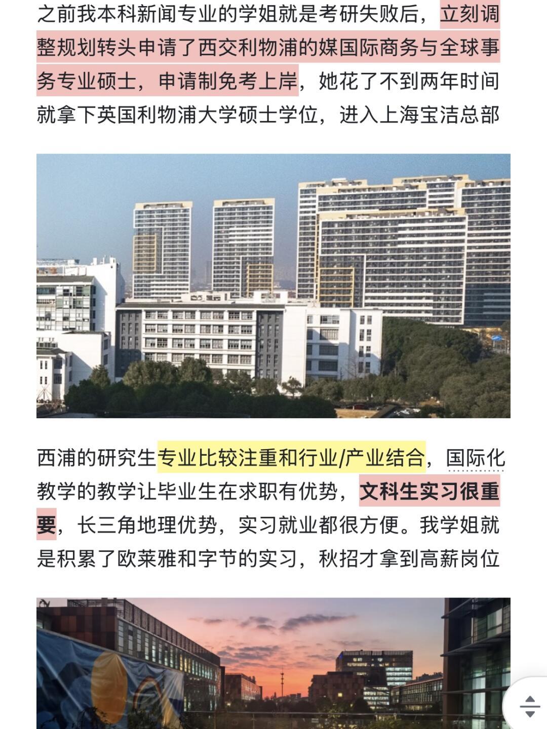 ②我新闻专业学姐考研失败后,调整规划申请西交利物浦国际商务与全球事务硕士,申请制免考上岸,不到两年就拿下英国利物浦大学硕士学位,还上岸上海宝洁总部,薪资很高。西浦研究生专业和产业结合,国际化教学求职有天然优势。文科实习很重要,长三角地理优势实习就业方便。我学姐读研就拿下欧莱雅和字节实习,秋招过关斩将拿到高薪岗位