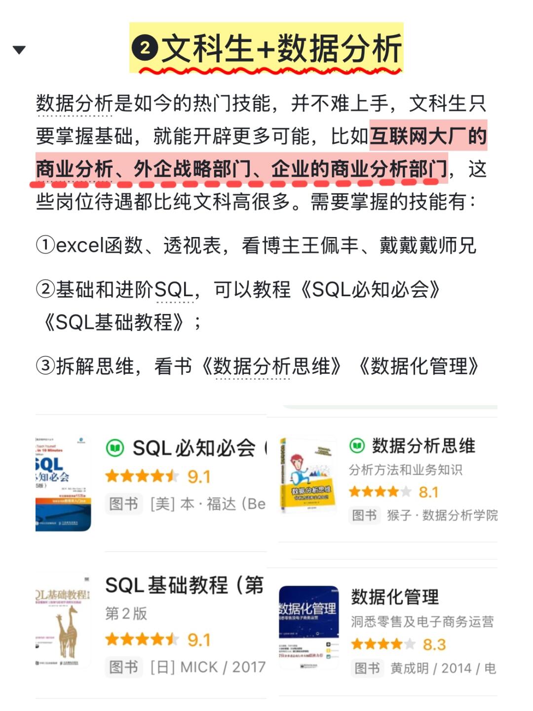 ①excel常用函数、透视表,看博主王佩丰、戴戴戴师兄;②基础和进阶SQL,看教程《SQL必知必会》《SQL基础教程》;③拆解思维,看书《数据分析思维》《数据化管理》