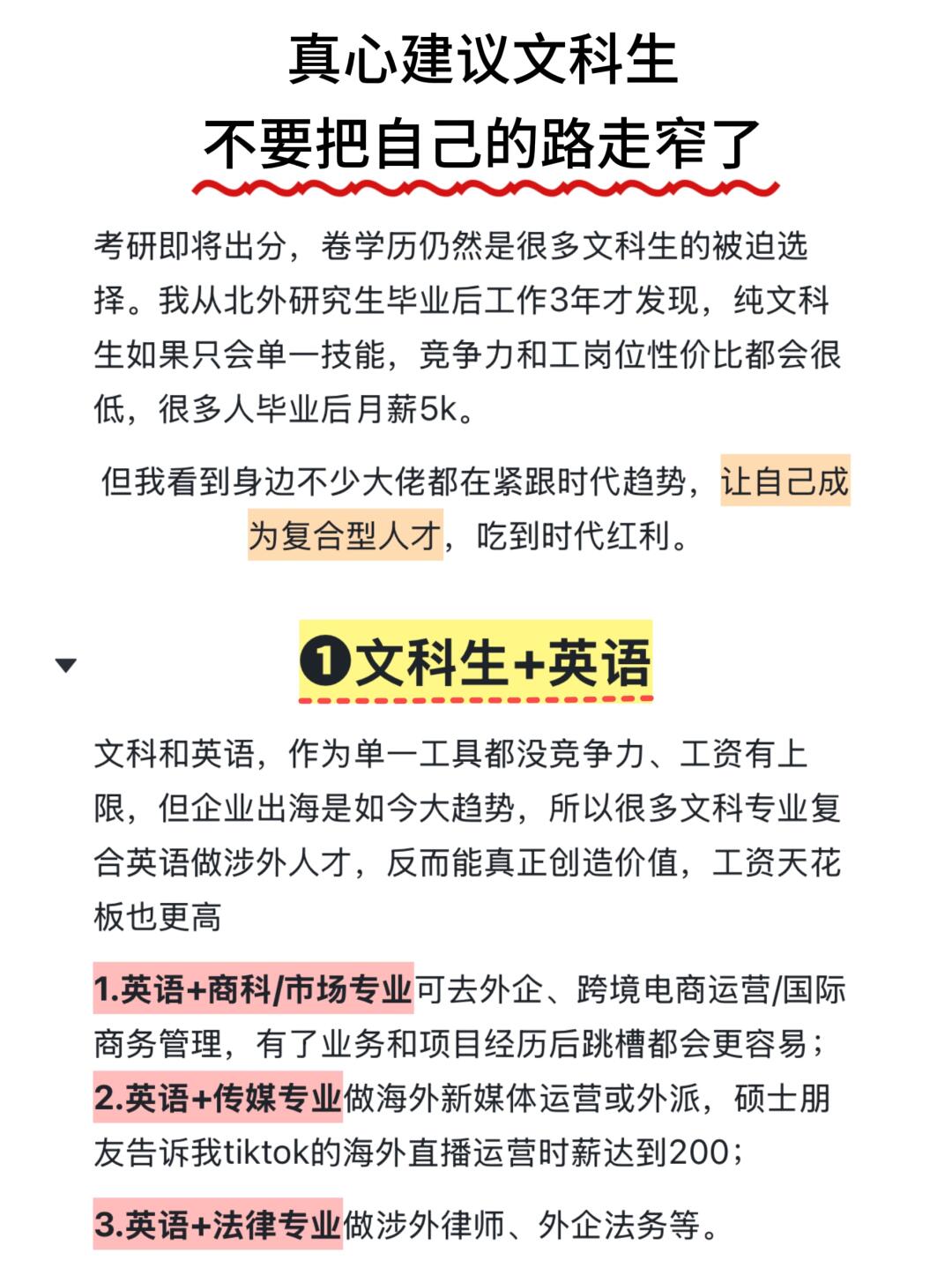 考研即将出分,卷学历仍是很多文科生被迫选择。我从北外毕业3年后才发现,纯文科生只会单一技能,岗位性价比会很低,很多人月薪5k。但我发现不少大佬都在紧跟趋势,成为复合型人才,吃到时代红利:
