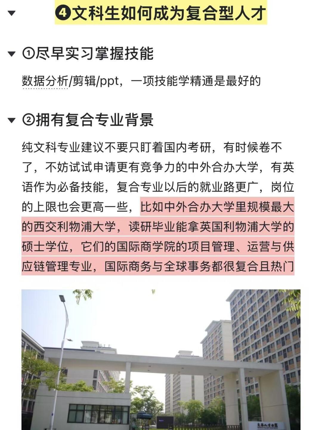 ①纯文科不要只盯着国内考研,不妨试试申请更有竞争力的中外合办大学,有英语作为必备技能,复合专业就业路更广,岗位上限更高。比如中外合办大学里规模最大的西交利物浦大学,读研毕业能拿英国利物浦大学硕士学位,专业里的国际商学院的项目管理、运营与供应链管理专业,国际商务与全球事务都复合且热门