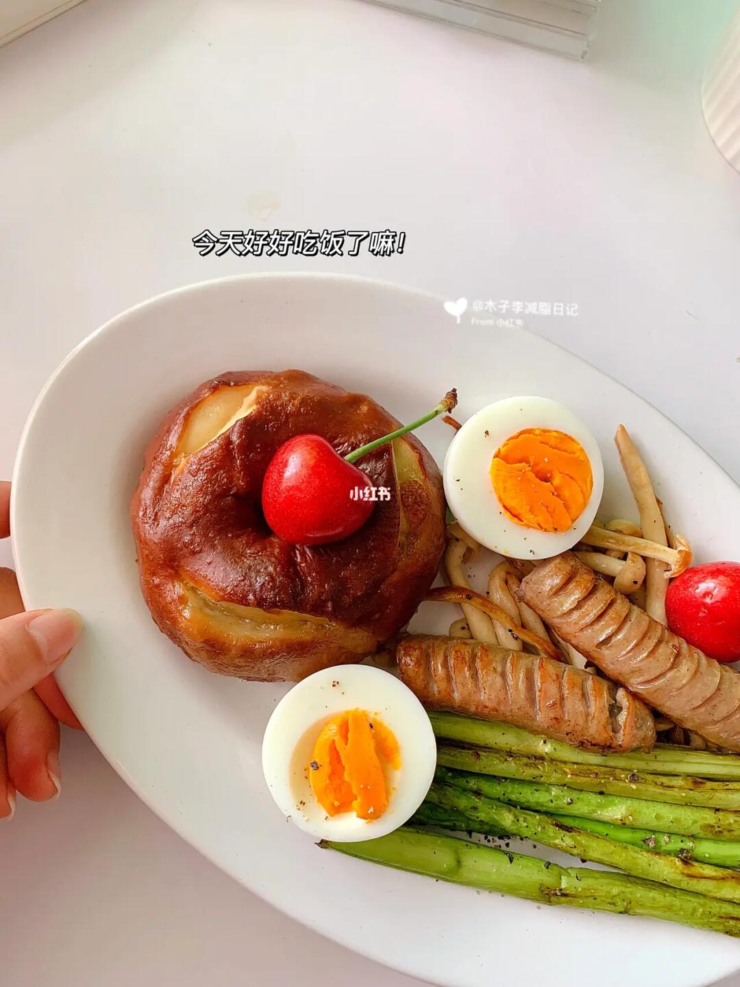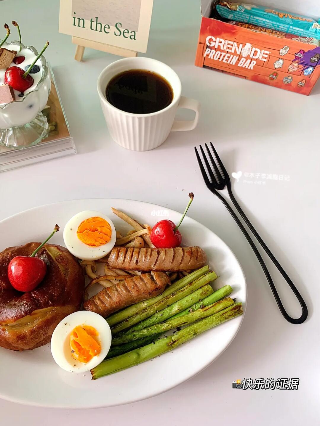 ☀️早餐:碱水贝果|肉肠|鸡蛋|芦笋|蛋白棒酸奶碗|黑咖啡☕